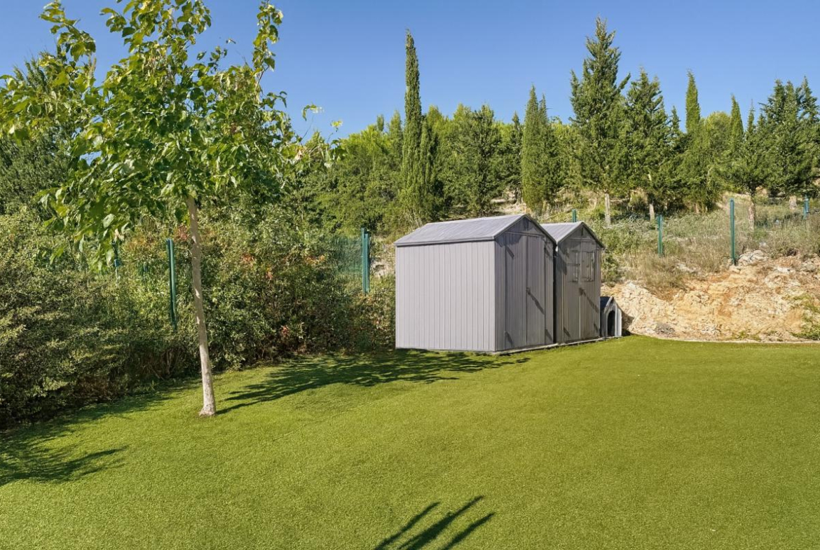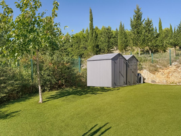 Le terrain, entièrement clôturé, permet le stationnement de plusieurs véhicules grâce à un portail coulissant motorisé avec visiophone. Légèrement en pente, il offre une jolie vue dégagée sur les montagnes environnantes.