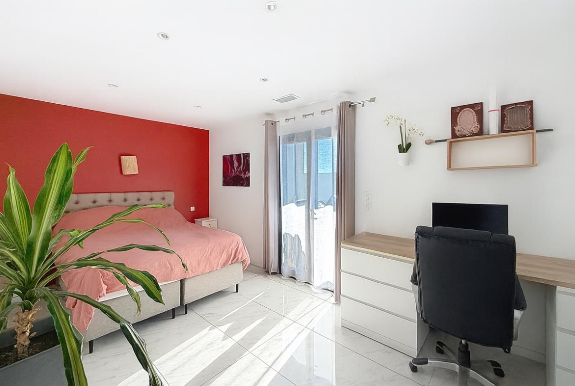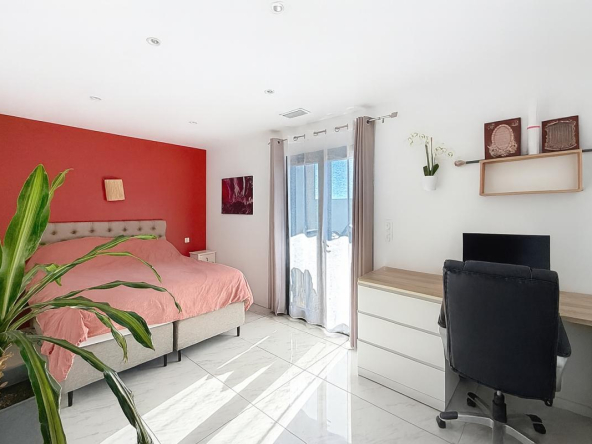 En complément, un logement indépendant de type T2 d’environ 35 m², doté lui aussi d’une terrasse avec pergola bioclimatique, vient parfaire l’ensemble. Ce logement, actuellement loué 550 euros par mois, dispose de son propre système de climatisation.