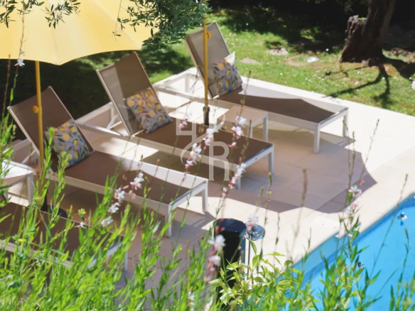 A l’ extérieur, vous profiterez d ‘ un magnifique parc paysager de 3850m2, richement arboré et parfaitement entretenu , offrant de vastes espaces de détente à l’ abri des regards . La piscine de 5×11 m s ‘ intègre harmonieusement au jardin.