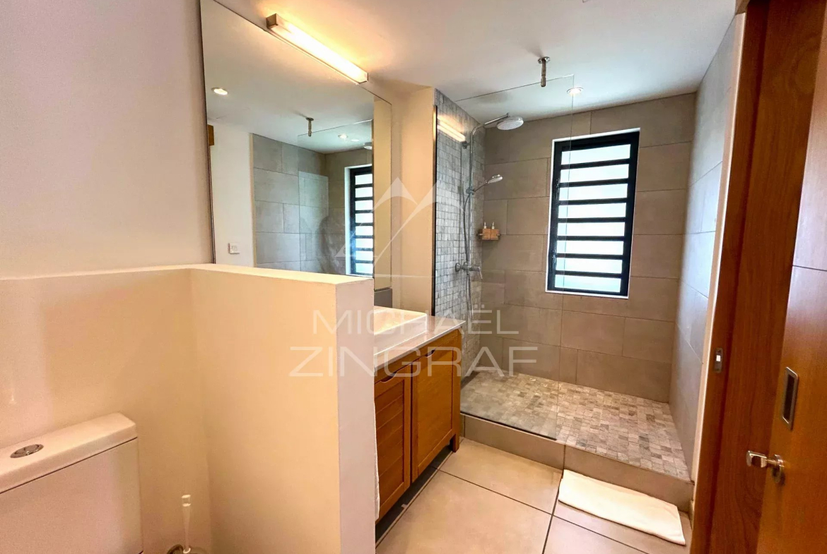 Des pièces à vivre spacieuses et lumineuses, dotées de matériaux et équipements haut de gamme. Grandes ouvertures donnant sur un jardin paysager à l’ambiance résolument tropicale.