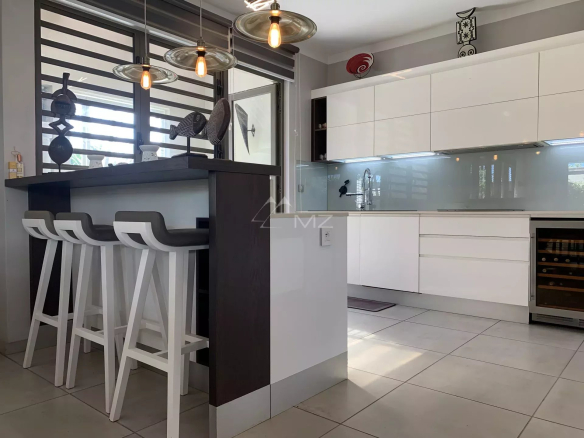 Cette villa contemporaine offre un agencement spacieux et moderne, avec une cuisine ouverte sur le salon et la salle à manger, créant un espace fluide et convivial pour la vie quotidienne et le divertissement.