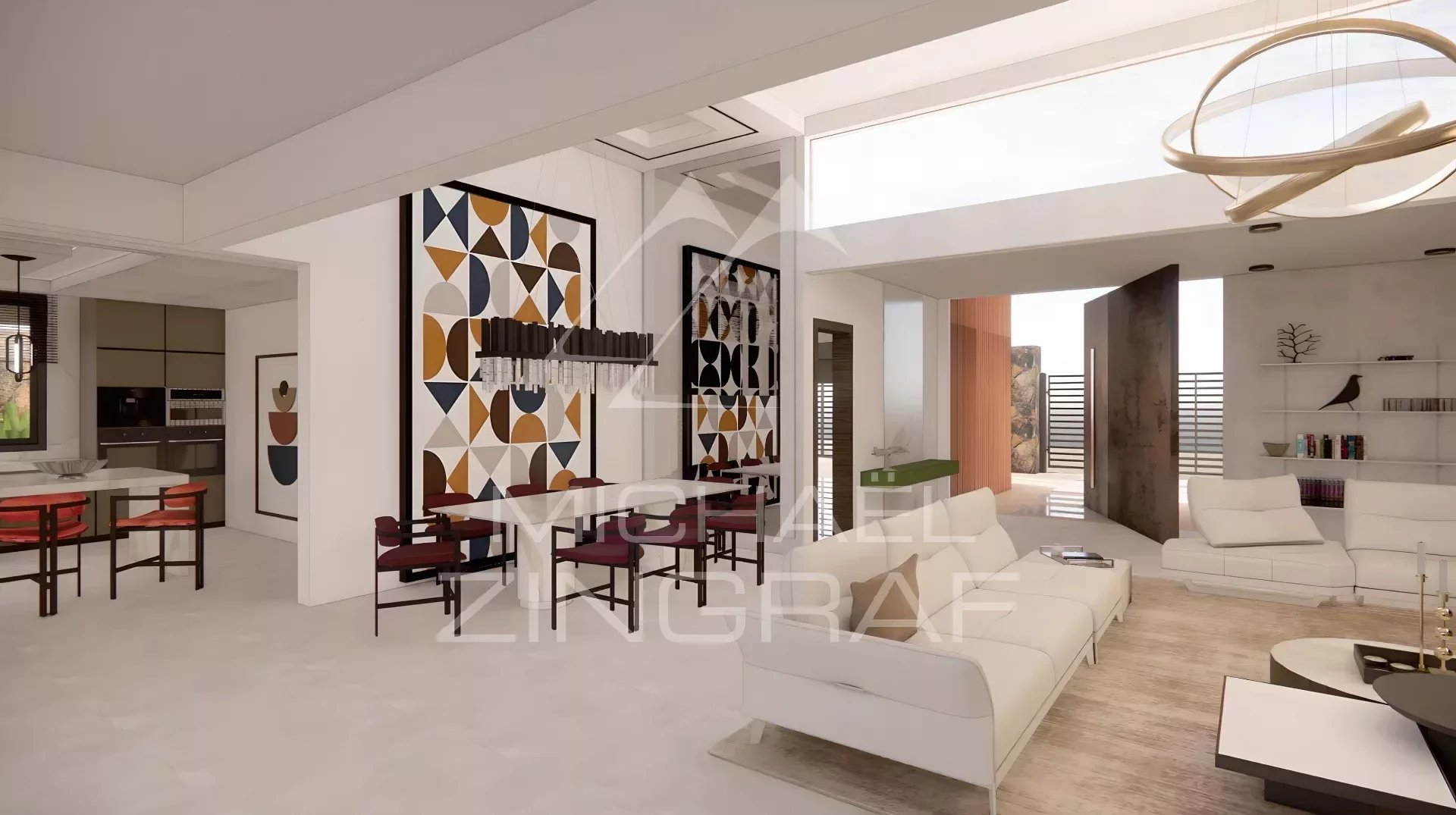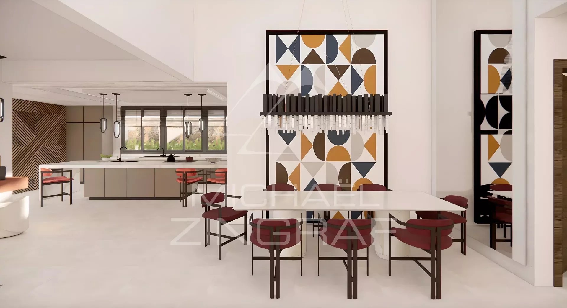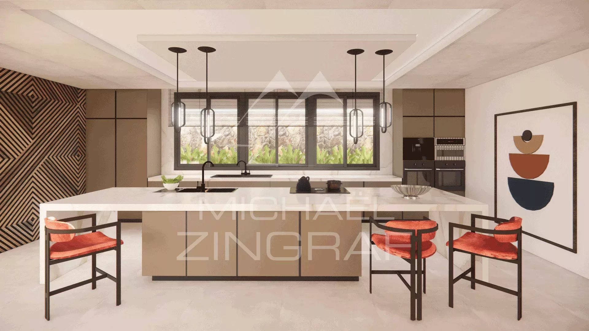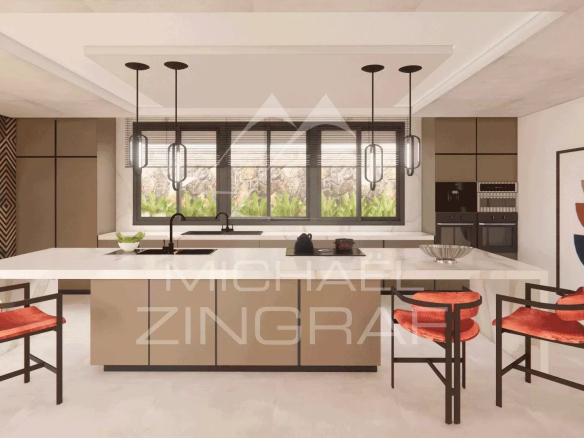 La cuisine et les dressings sont entièrement réalisés sur mesure. La cuisine est équipée d’électroménagers (réfrigérateur américain, four, micro-ondes, plaque de cuisson, hotte aspirante, lave-vaisselle et lave-linge) de marques internationales réputées – Samsung, AEG ou LG.