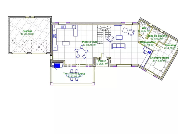 🔹 Rez-de-jardin : elle se compose d’un séjour/cuisine de plus de 83 m², ouvrant sur une terrasse couverte et d’une suite parentale d’environ 30 m² comprenant chambre, salle d’eau, dressing et WC.