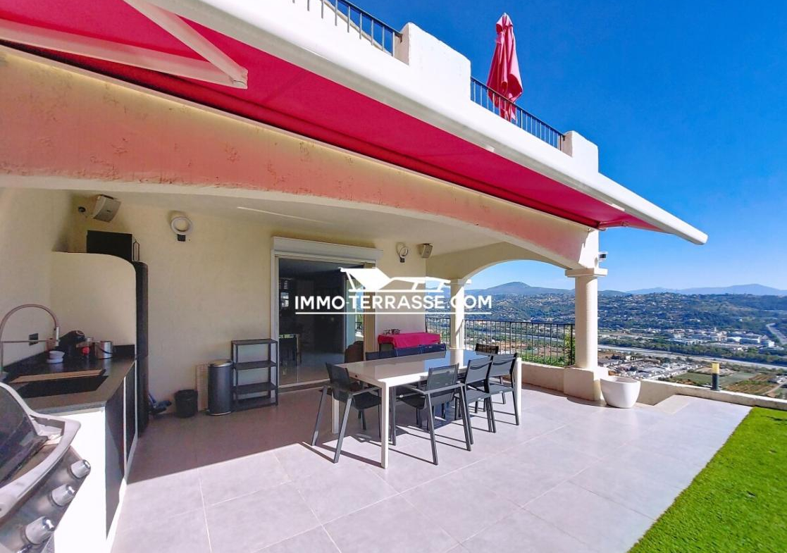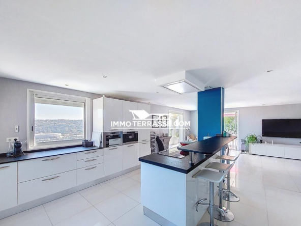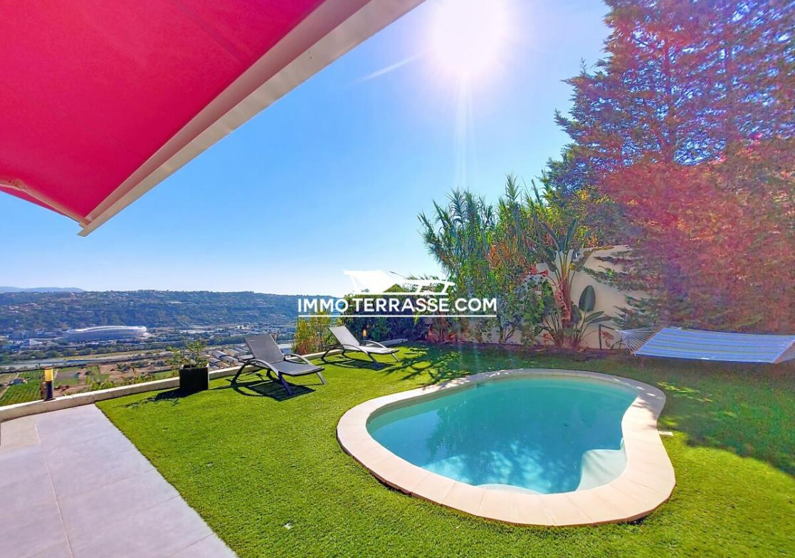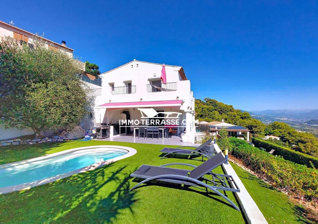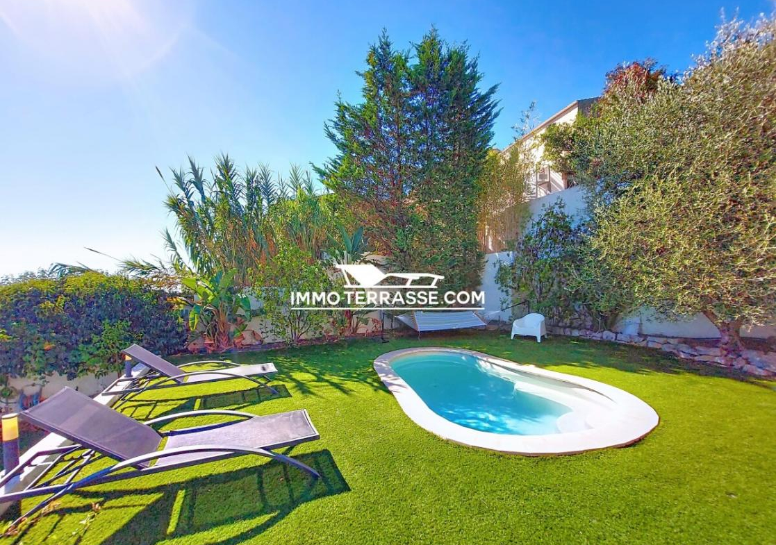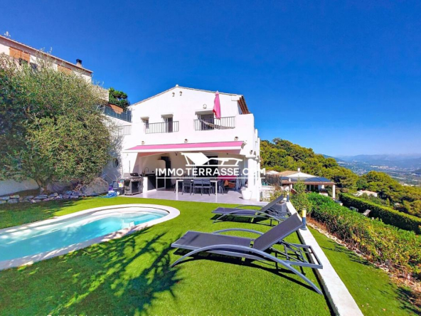A vendre en co-exclusivité, charmante villa sur les hauteurs de Saint-Laurent-du-Var avec piscine, superbe vue sur les collines, les montagnes et la mer.