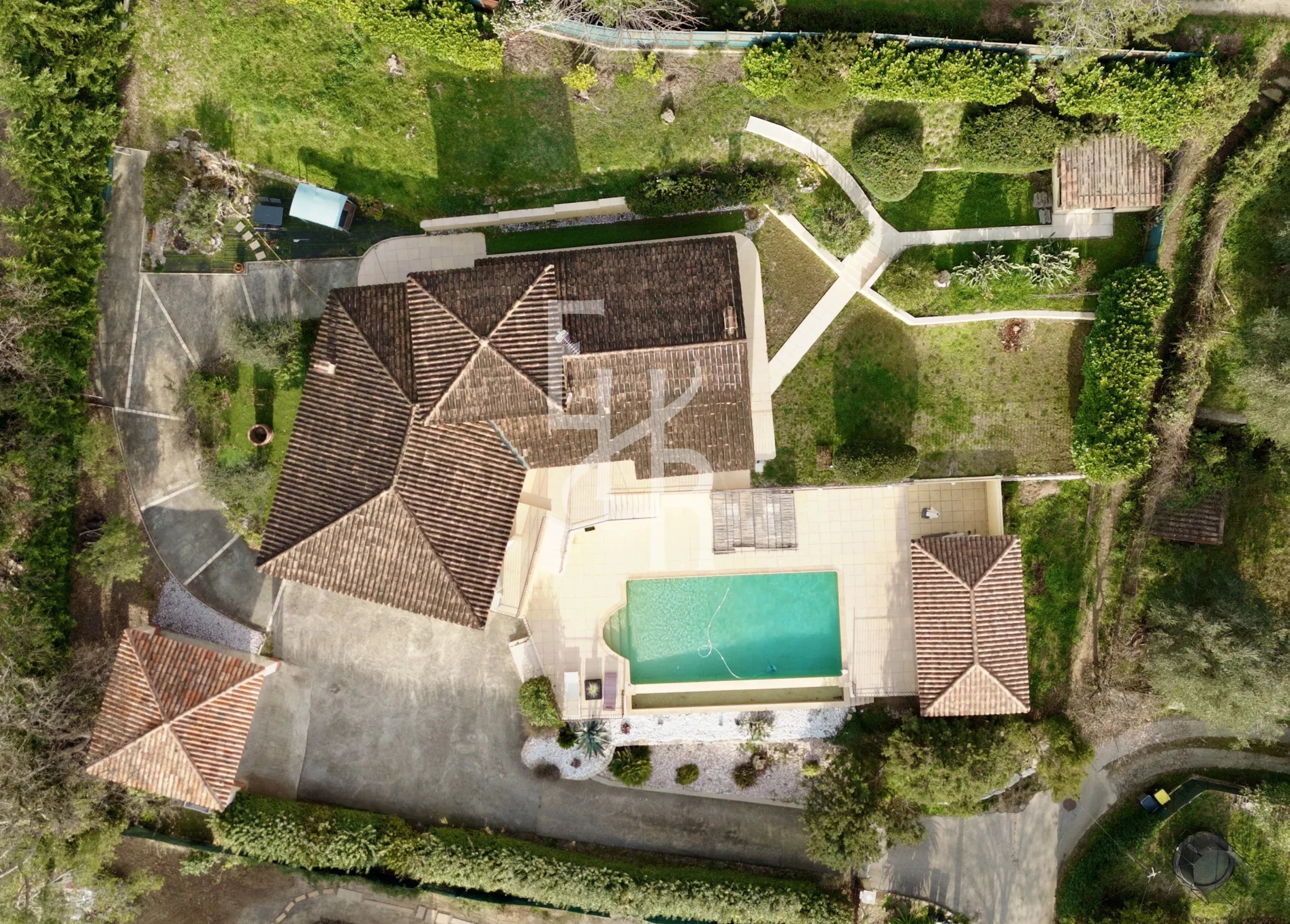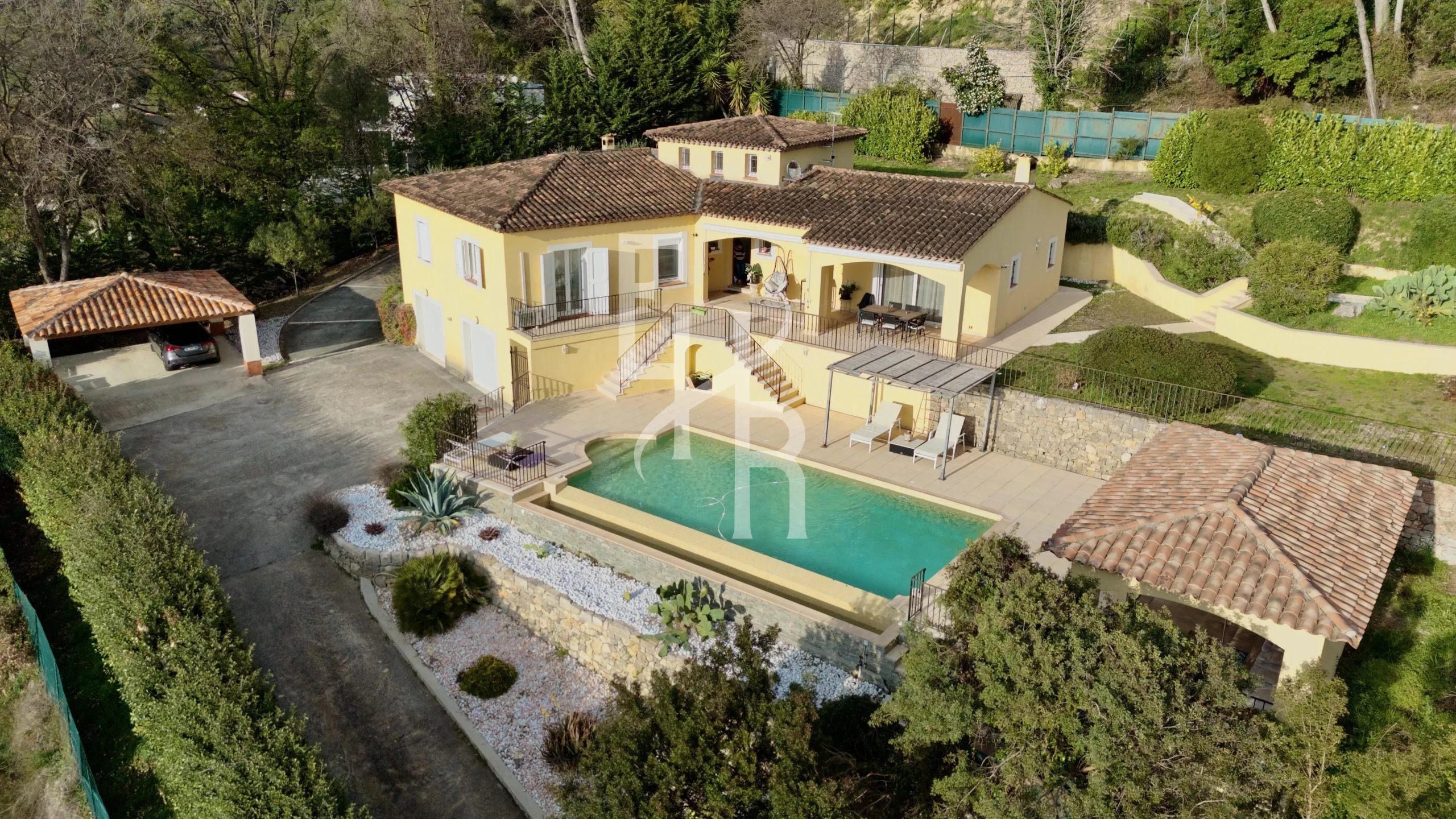 À l’extérieur, le terrain d’environ 2 000 m² aménagé en restanques accueille un jardin méditerranéen agrémenté d’oliviers et de différentes essences locales. Une piscine avec pool-house, parfaitement intégrée dans l’environnement, invite à la détente tout en profitant du paysage.