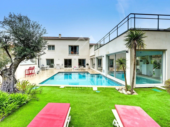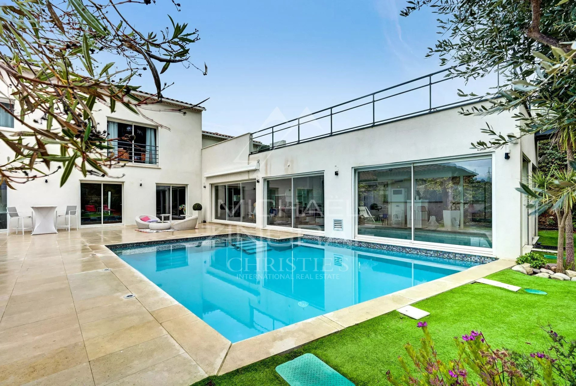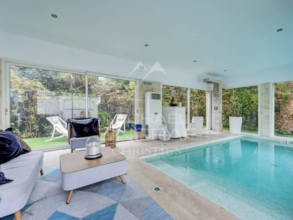 À l’extérieur, le terrain paysager d’environ 2 000 m², véritable écrin de verdure, propose divers espaces dédiés à la détente : pool-house avec bar, cuisine d’été, douche, jacuzzi et terrain de pétanque.