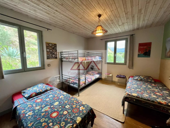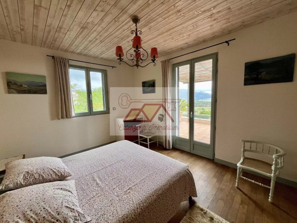 À l’étage, entièrement revêtu de parquet en chêne massif et en pierre, vous trouverez trois chambres, dont une suite avec salle d’eau et WC, et deux chambres donnant sur une sublime terrasse avec pergola de 32 m², offrant une vue imprenable sur le golfe d’Algajola, jusqu’à la Révellata et son magnifique coucher de soleil.