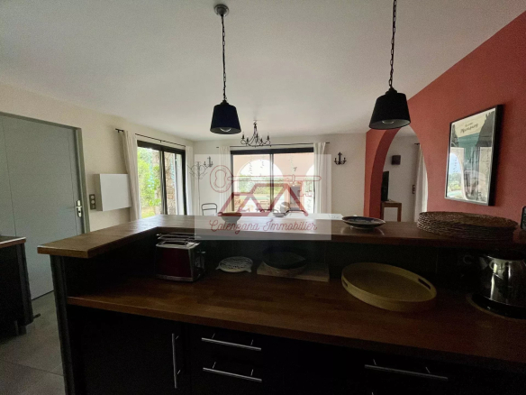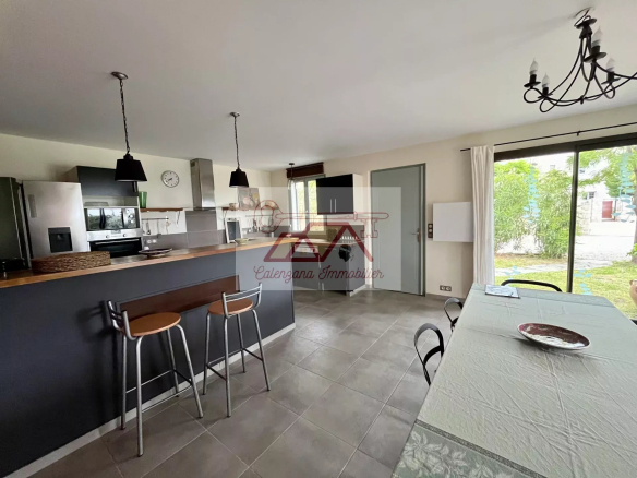 Construite en 2012, la villa d’environ 120 m² habitables sur deux niveaux, se compose au rez-de-chaussée, d’un double séjour avec cuisine ouverte et bar, buanderie, WC, ainsi que d’une terrasse couverte offrant une vue sur la piscine et le jardin.