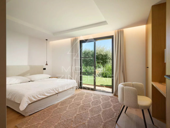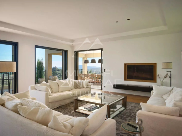 A proximité du village et blottie au cœur d’un écrin de verdure, cette villa contemporaine de 311 m² s’étend sur un terrain d’environ 2 276 m², offrant une vue sur le Golfe de Saint-Tropez et le Château de Grimaud.