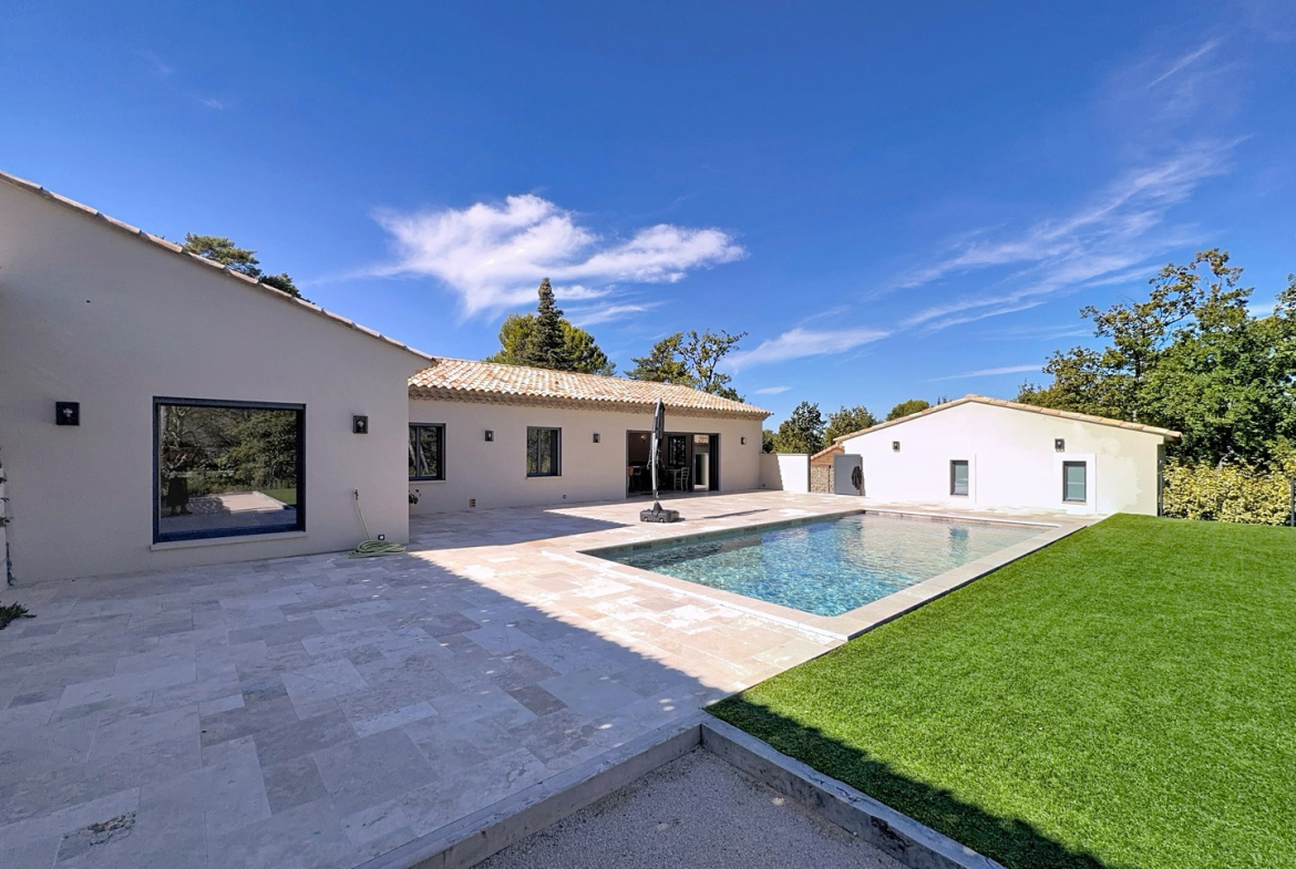 D’une surface habitable d’environ 150 m2, la maison s’articule autour d’une vaste pièce de vie traversante baignée de lumière, ouvrant par de larges baies vitrées à galandage sur une terrasse de 160 m2 et une piscine maçonnée chauffée (9×4 m), avec en toile de fond le Mont Ventoux et la pinède.
