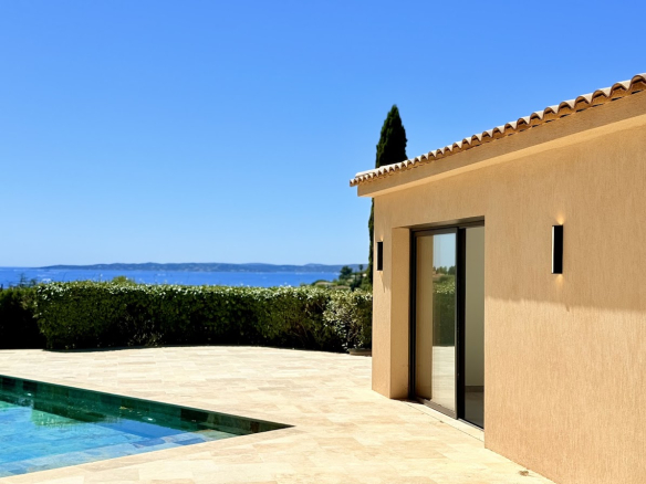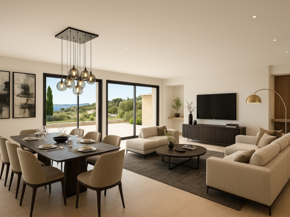 Surface habitable : 250 m² | Terrain : 1 183 m² | Chambres : 4 | Construction : 2025 – Neuf | Exposition : Sud | Prestations : Piscine, jardin paysagé, garage, terrasses, vue mer panoramique