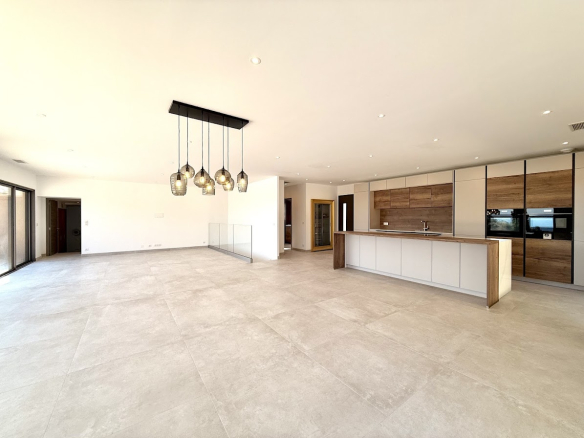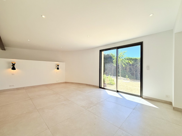La villa développe environ 250 m² de surface habitable sur un terrain de 1 183 m². L’architecture est fluide, lumineuse, pensée pour le confort et la contemplation. La pièce de vie principale, baignée de soleil grâce à ses baies vitrées plein sud, s’ouvre sur une terrasse avec vue panoramique sur la Méditerranée. La cuisine américaine, conviviale et équipée, se prolonge par un cellier discret.