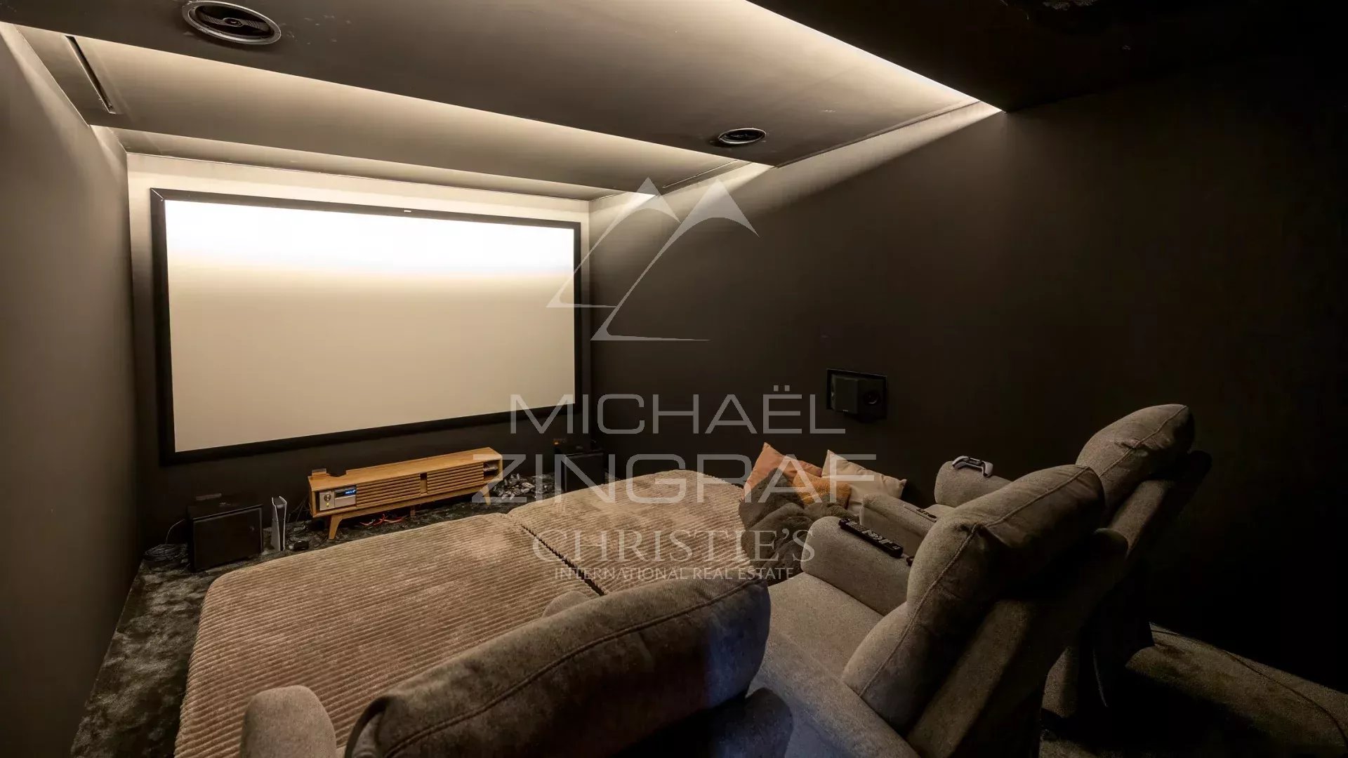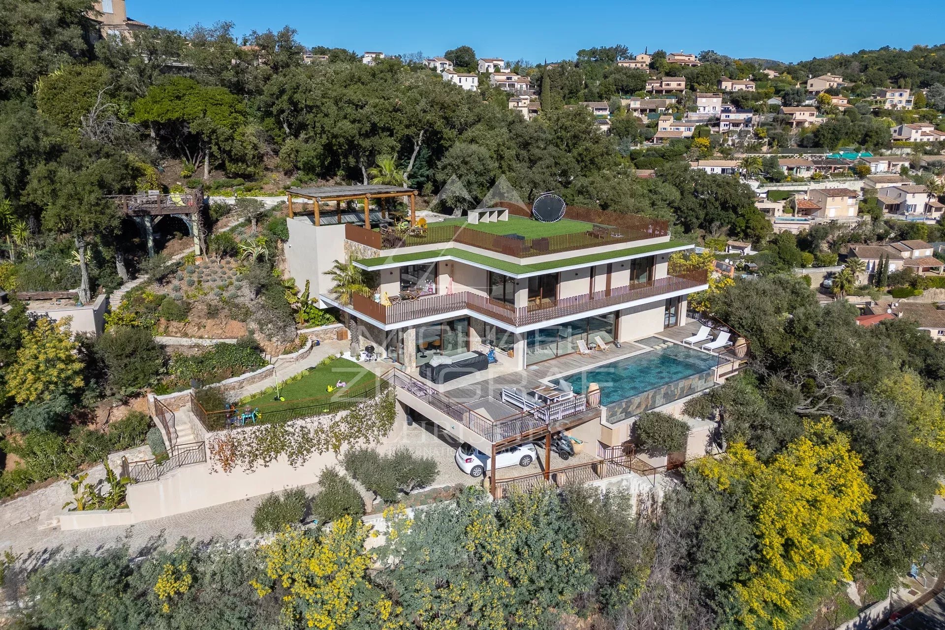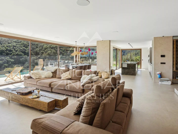 Située à seulement 12 minutes des plages, des restaurants et du port de Mandelieu-La-Napoule, cette villa moderne développe plus de 400 m² (environ 318 m² habitables). Édifiée sur un terrain de plus de 2 000 m² exposé plein sud, elle est à l’abri des regards et des nuisances sonores, au cœur d’un domaine sécurisé en bordure de la forêt du massif de l’Estérel.