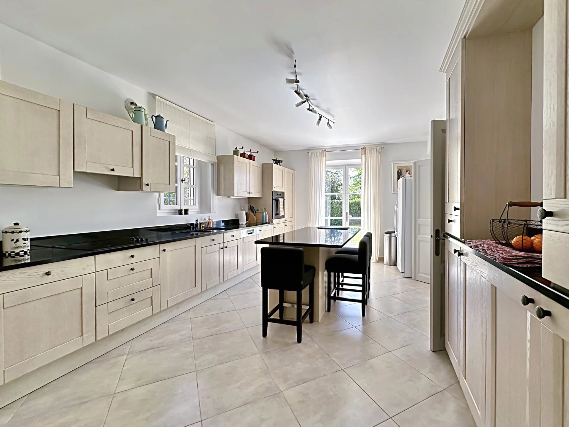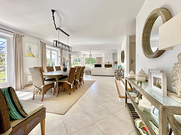 Dès l’entrée, un patio mène à un hall avec toilettes invités, puis à un salon lumineux avec cheminée s’ouvrant sur une large terrasse couverte pour prolonger vos soirées d’été. La salle à manger se prolonge sous une pergola conviviale, tandis que la grande cuisine entièrement équipée, complétée par un cellier et une buanderie.