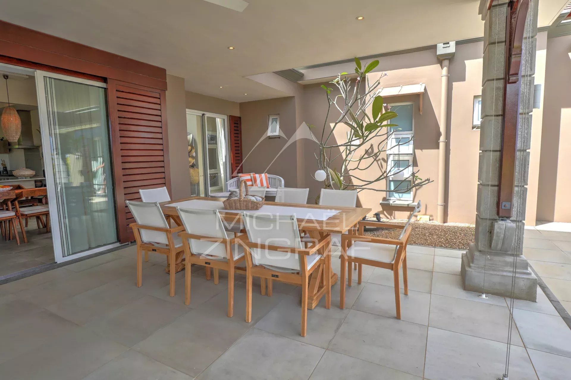 Nichée sur les hauteurs d’Heritage Villas Valriche, cette villa de 418 m² se distingue par son architecture moderne qui conserve un caractère authentiquement tropical. Pensée pour le confort absolu, elle propose des espaces de vie spacieux, de plain-pied, sans aucun escalier.