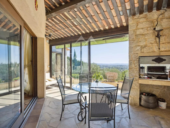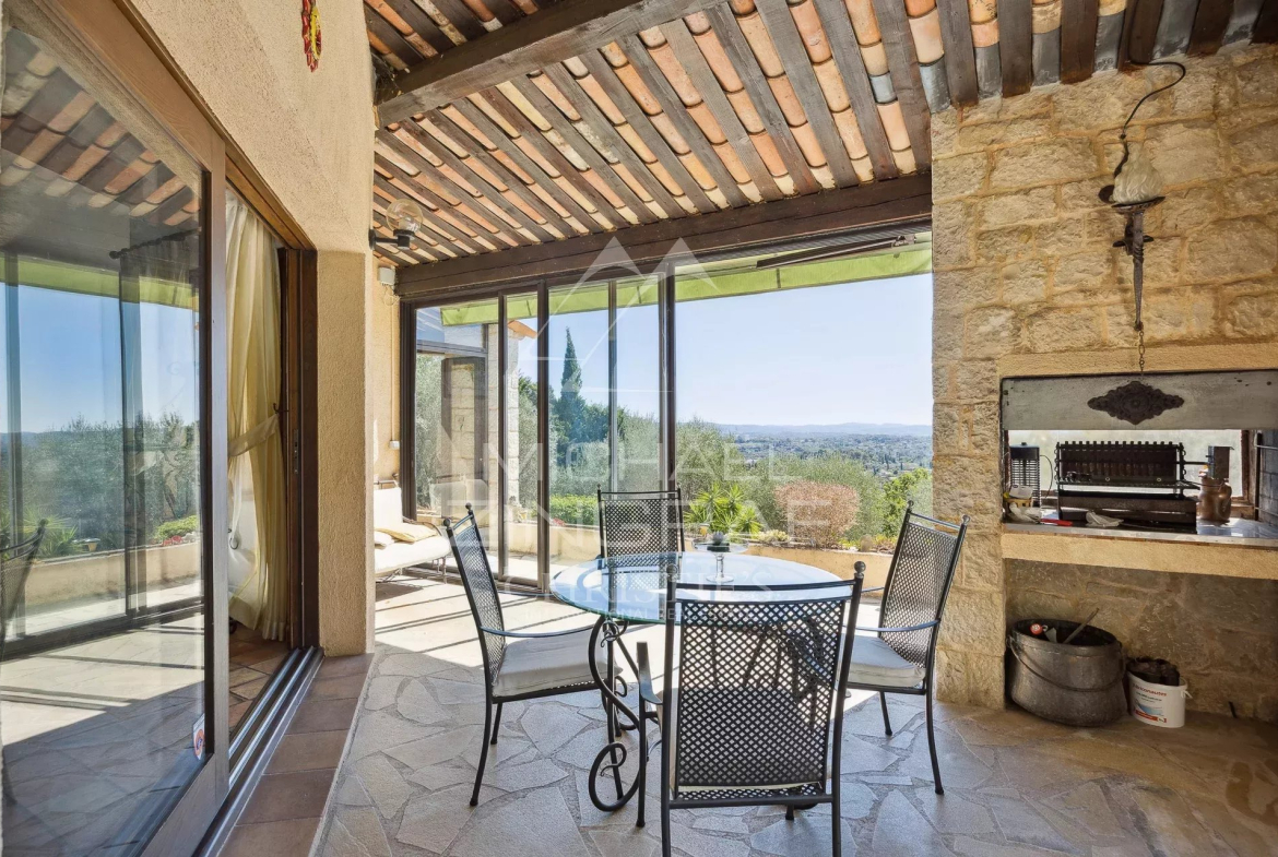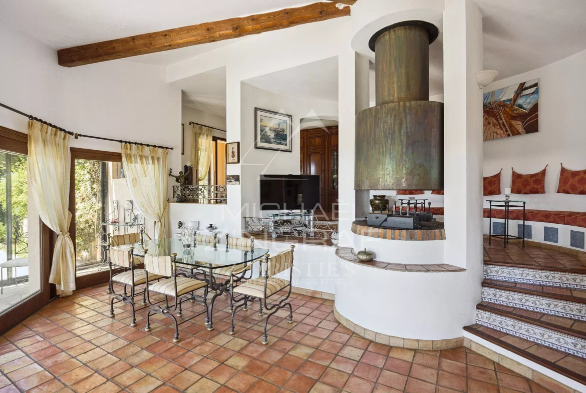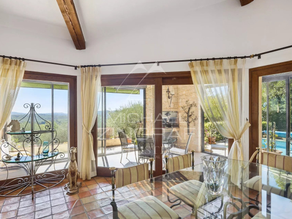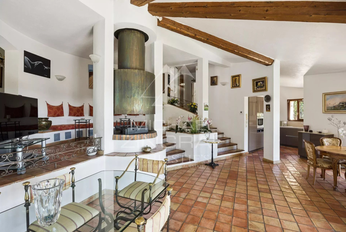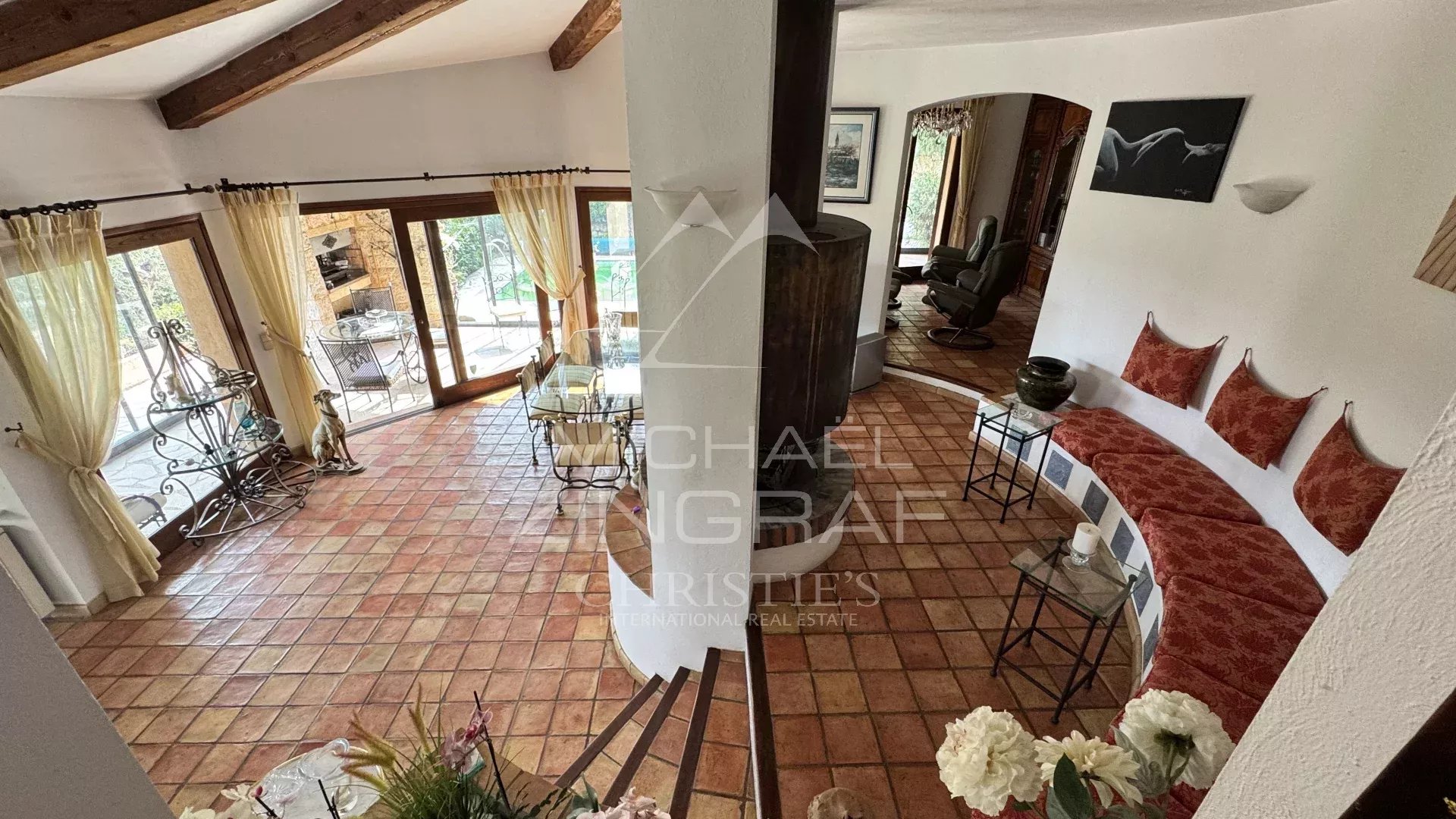 Située au calme, au fond d’une impasse, la propriété domine les collines et l’oliveraie, avec en perspective la ligne de mer.