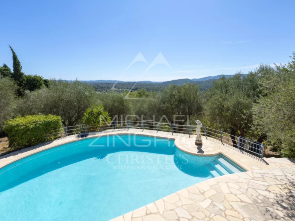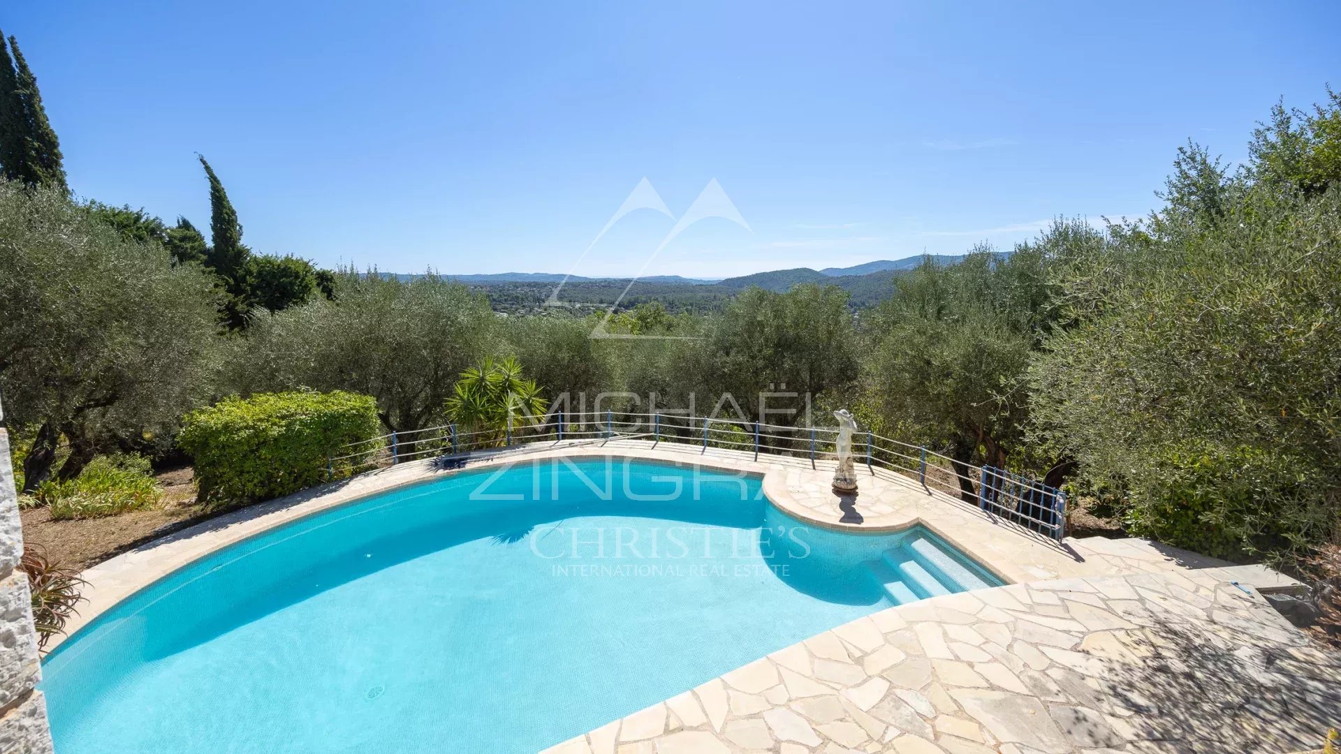 Villa située sur un terrain de 2 500 m², entourée d’une oliveraie et de massifs fleuris, avec une piscine principale et un bassin d’agrément attenant à la terrasse du salon.