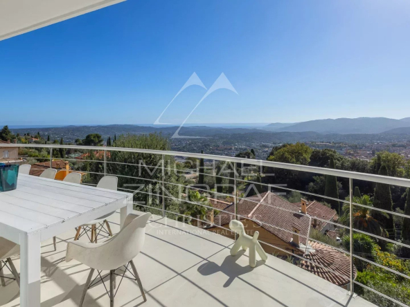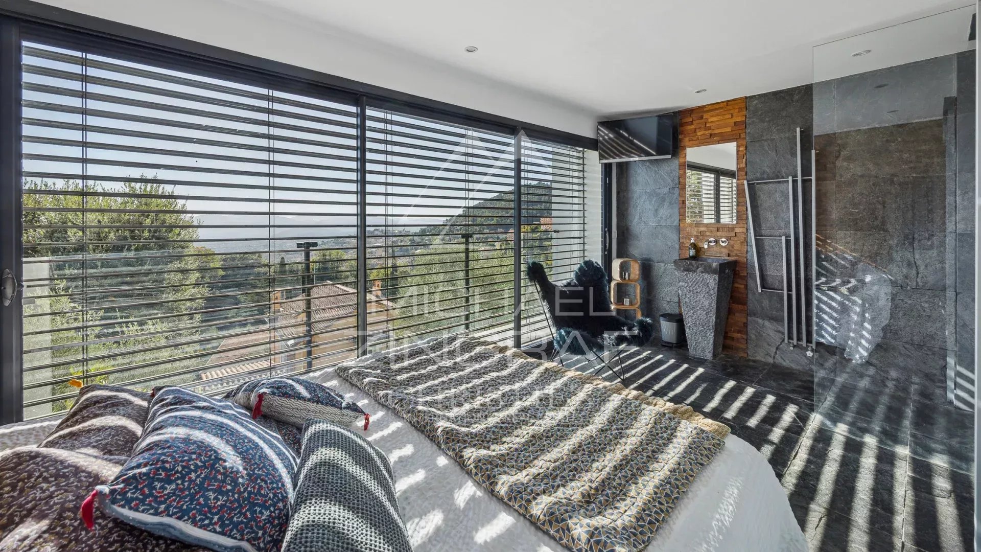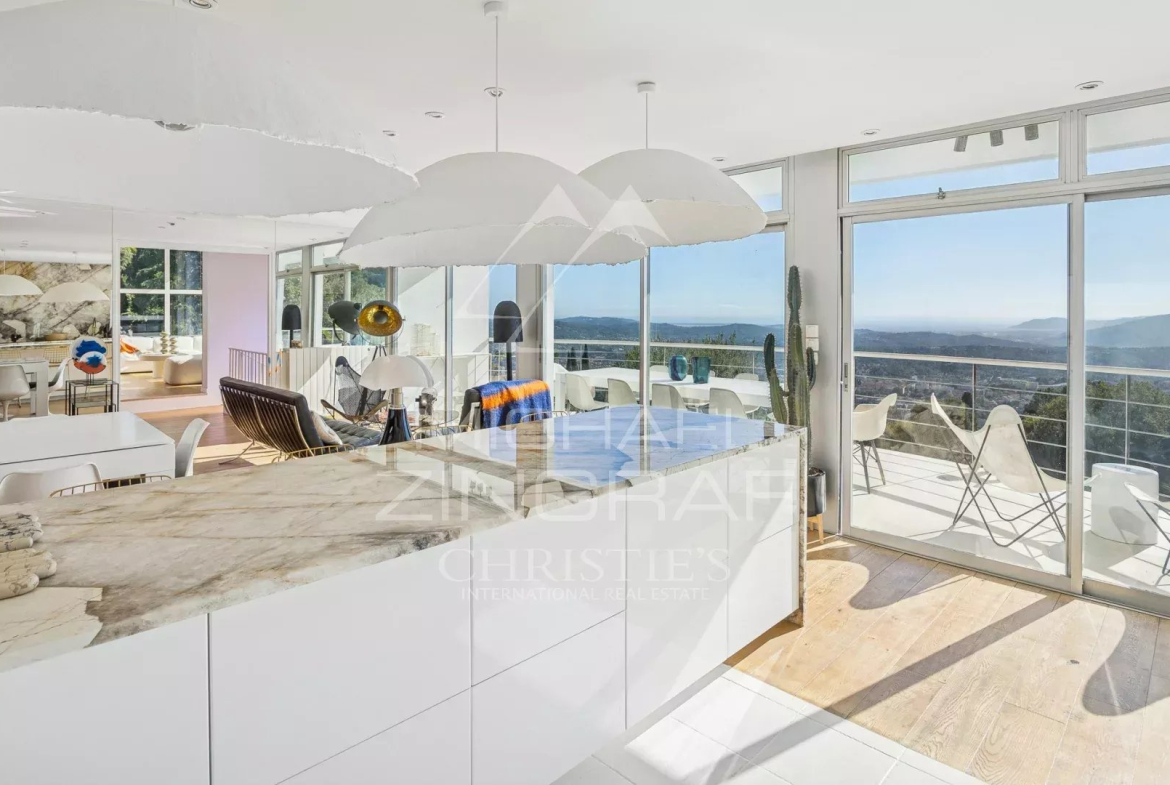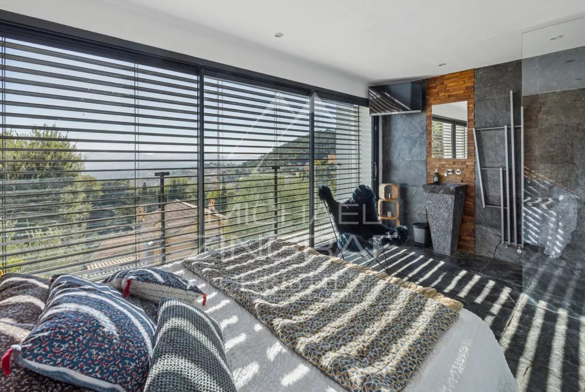 Située dans un environnement calme, cette villa d’architecte d’environ 200 m² bénéficie d’une vue mer panoramique exceptionnelle, dominant la vallée jusqu’à la Méditerranée.