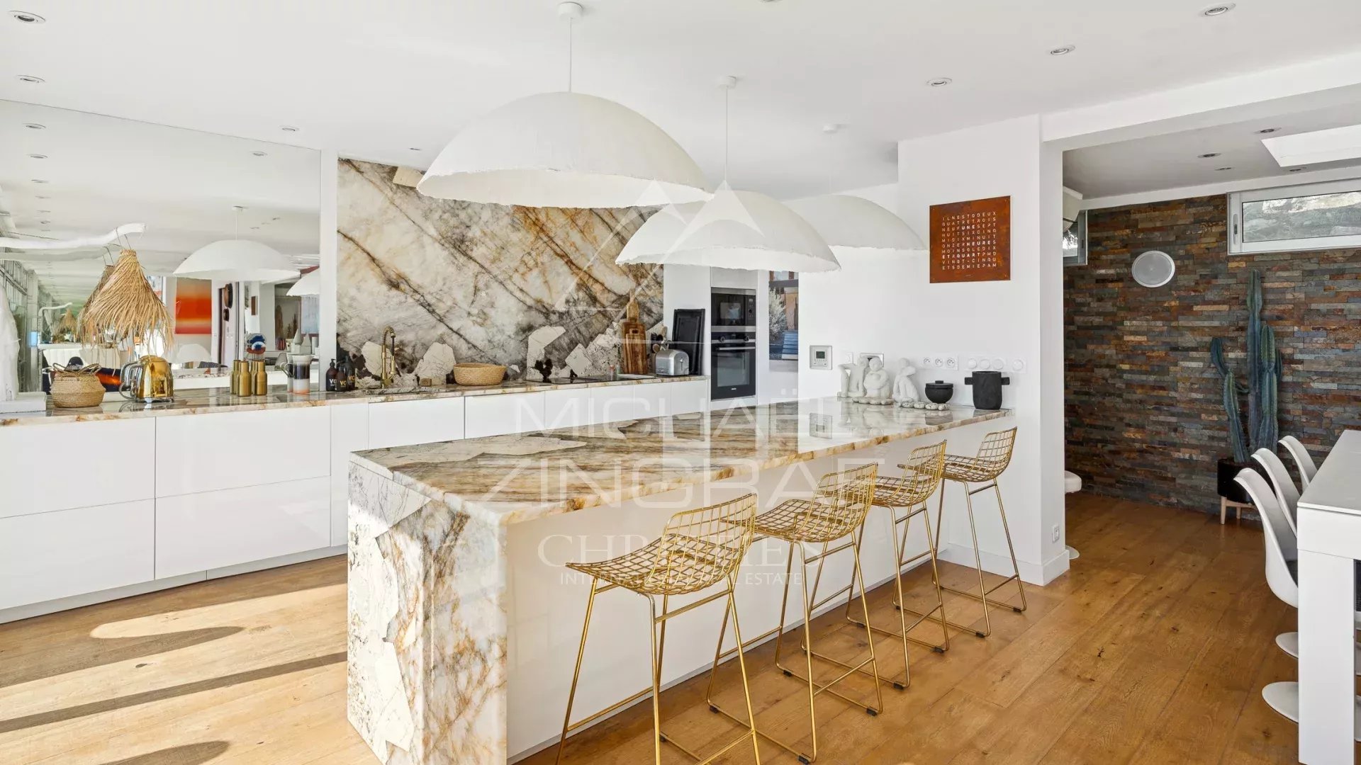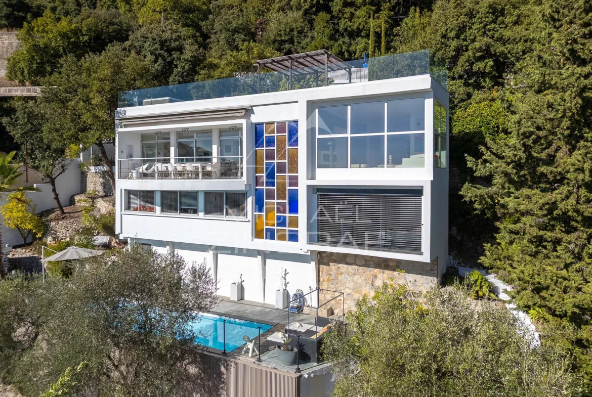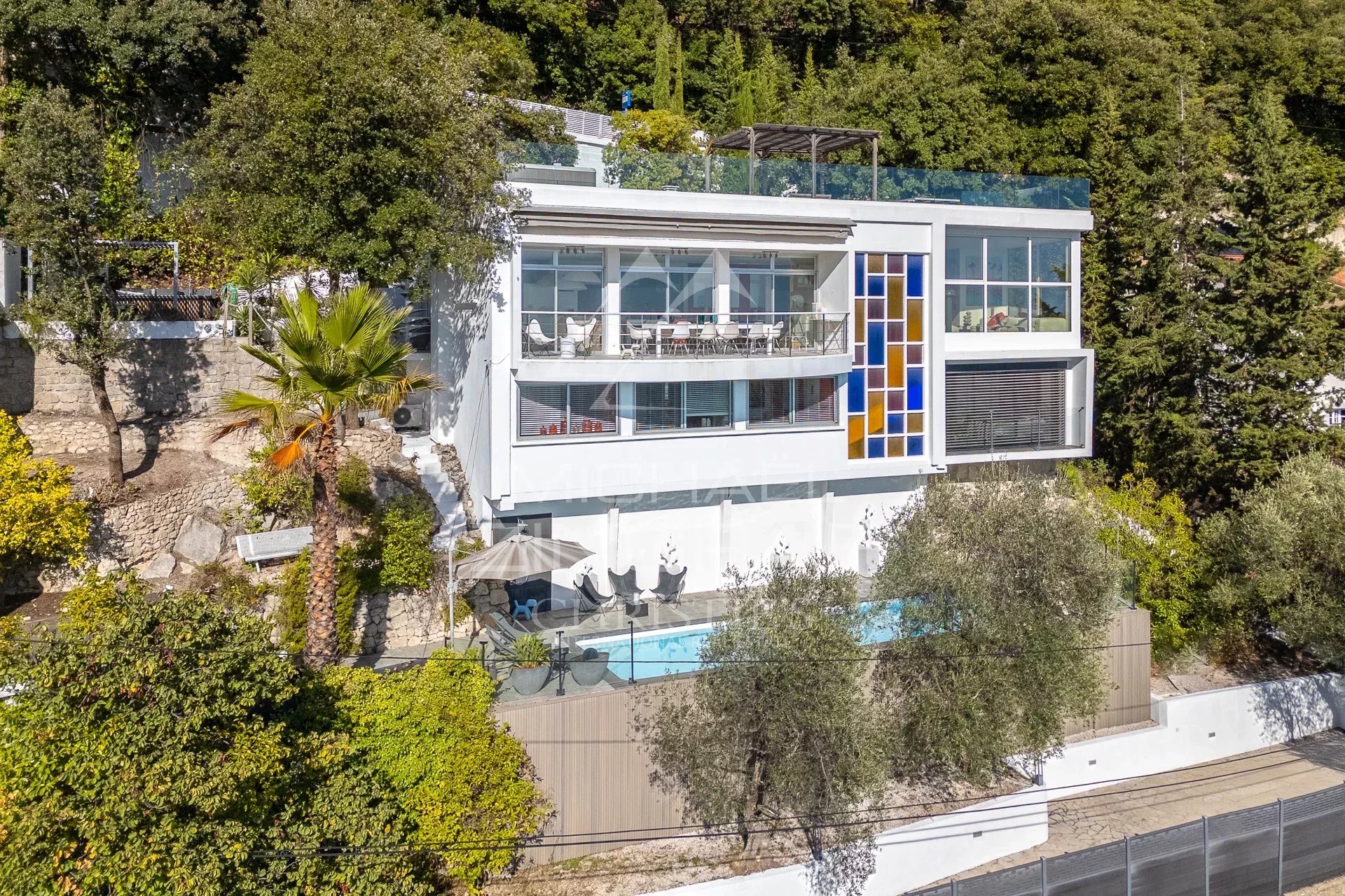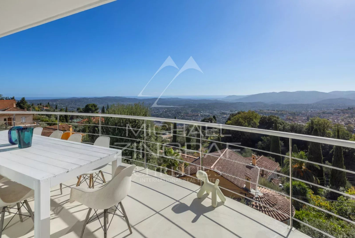 Située dans un environnement calme, cette villa d’architecte d’environ 200 m² bénéficie d’une vue mer panoramique exceptionnelle, dominant la vallée jusqu’à la Méditerranée.