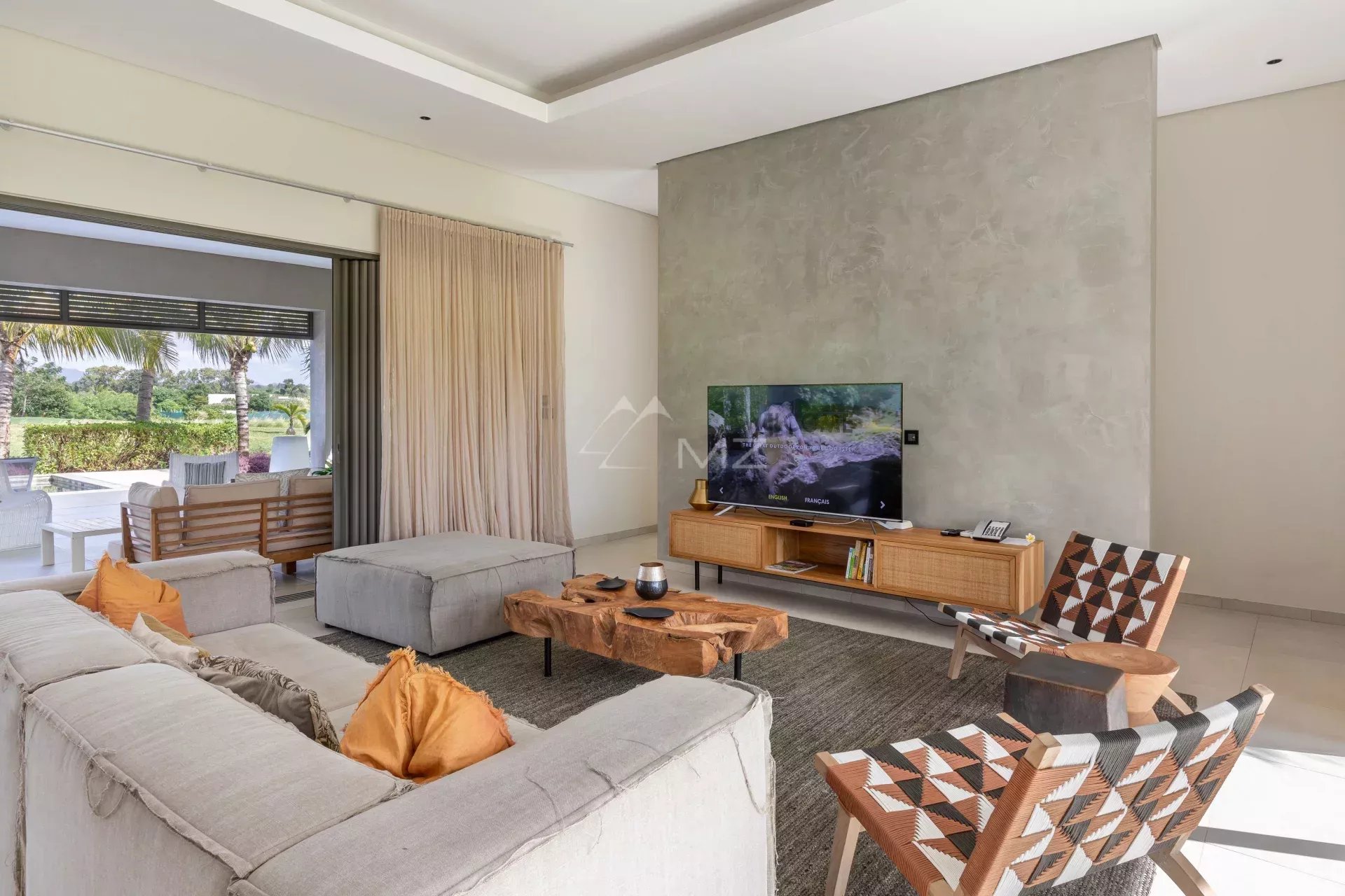 Elle comprend quatre chambres avec salles de bains attenantes, dressing, et une douche extérieure pour la suite parentale. La cuisine moderne et équipée s’ouvre sur le salon intérieur, prolongé par un salon très spacieux et cosy.