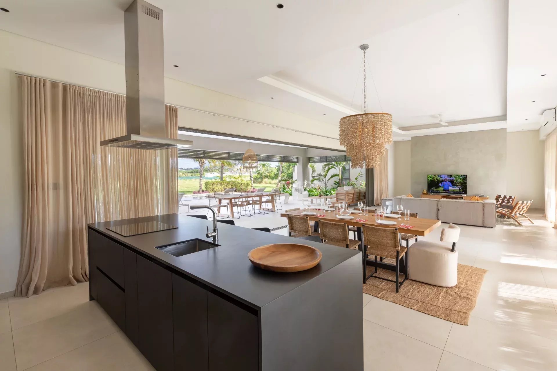 Abritée des vents généraux et exposée ouest, l’immense varangue aménagée avec salon et salle à manger d’extérieur donne sur la piscine en pierres naturelles de 48 m².