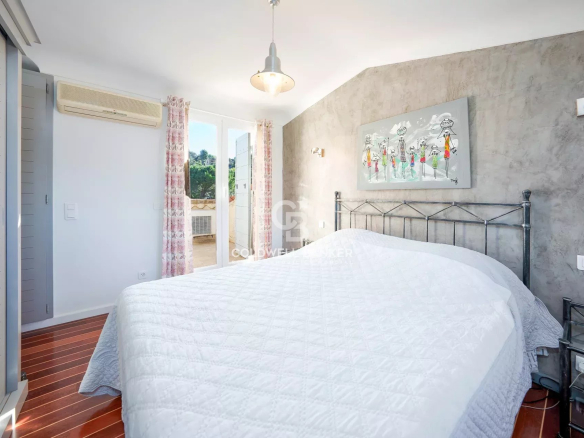 Étage : Un bureau en mezzanine, pouvant être transformé en salle de bain ou en petite chambre, mène à une chambre avec une terrasse tropézienne, accompagnée de toilette.