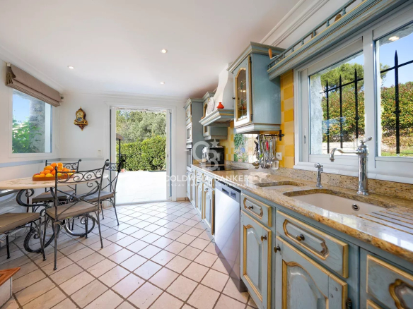 Extérieurs : Le portail en fer forgé automatique s’ouvre sur une esplanade pavée en granit, éclairée par des plots solaires. Une vaste terrasse de 100 m² équipée d’une cuisine d’été (avec four à pizza, barbecue et vasque en pierre marbrière). La piscine est chauffée par une pompe à chaleur et entourée d’une plage de 150 m² sécurisée par des balustres en pierre marbrière du Liban. Une douche solaire et une pergola en fer forgé complètent cet espace de détente.