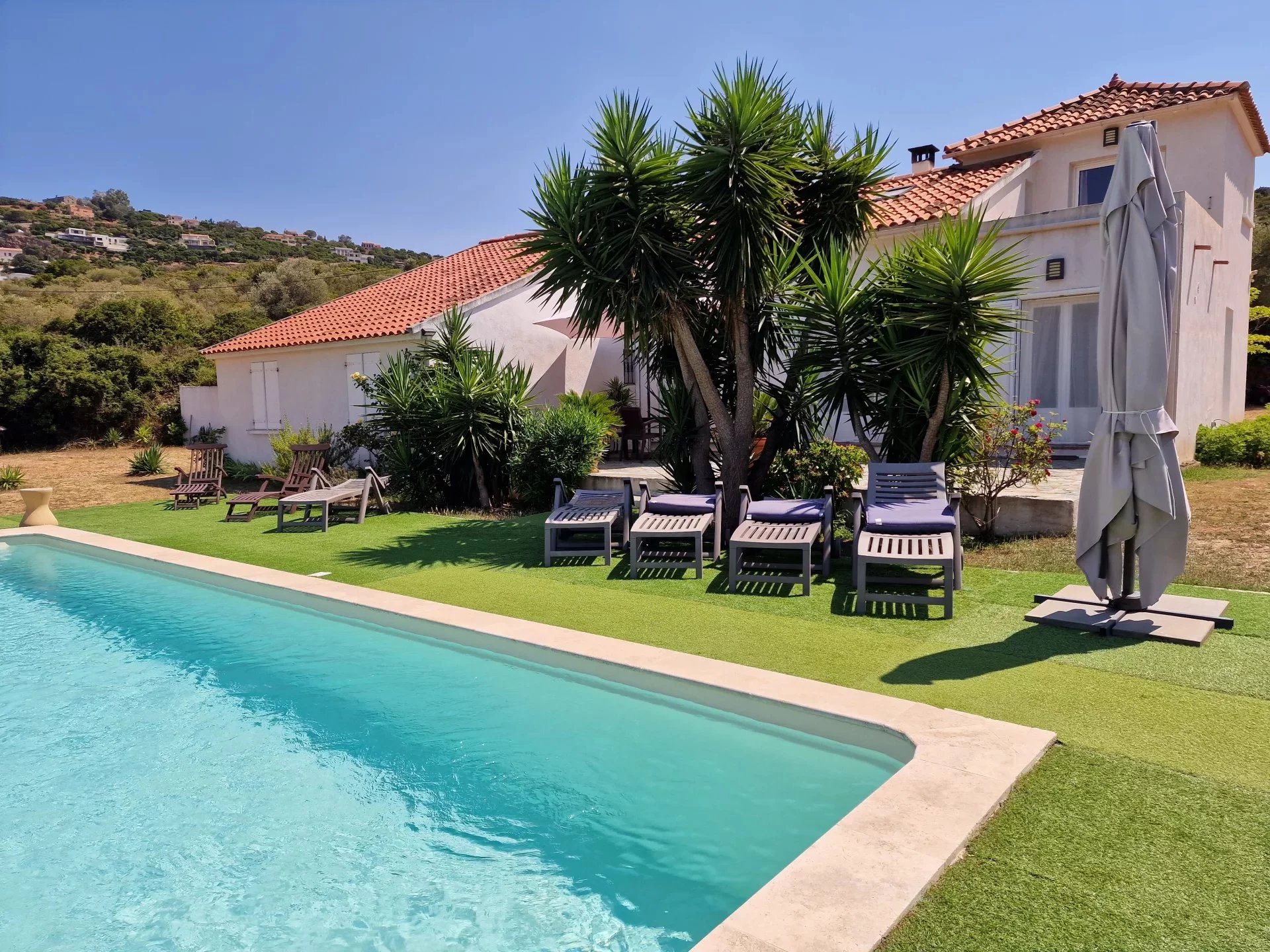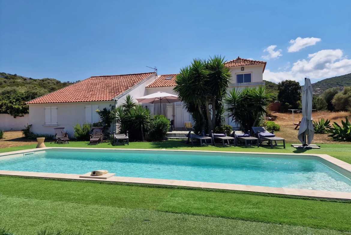 Villa de charme 170 m² à vendre à Saint-Florent, à 5 min à pied de la plage de la Roya, Haute-Corse. Terrain 2 300 m², 5 chambres, piscine, pool house, parking 10 véhicules.