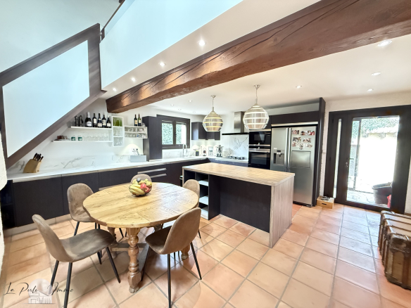 Edifiée sur une vaste parcelle de 2122 m2, cette villa 4 faces allie tradition et confort. Conçue dans un style architectural classique, elle vous séduira par son intérieur spacieux, où chaque détail a été pensé pour offrir une ambiance chaleureuse et accueillante. Le hall d’entrée ouvre sur un grand séjour lumineux, agrémenté d’une cheminée centrale à foyer fermé et d’un plafond cathédrale avec poutres apparentes. L’espace de vie donne directement sur une terrasse de 60 m2, équipée d’un barbecue, idéale pour vos moments de convivialité en plein air.