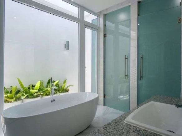 style moderne de cuisine européenne et grand salon, chambre principale avec salle de bain en suite, belle baignoire donnant sur la piscine privée,