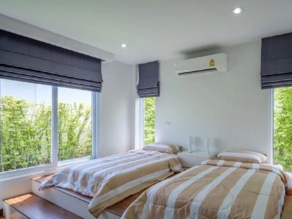 La deuxième chambre a des collections Tokyo séparées à 2 lits, avec une marche en bois permettant de voir la vue depuis la fenêtre avec vue sur la verdure et le style d’accouplement de la garde-robe.