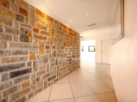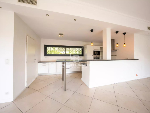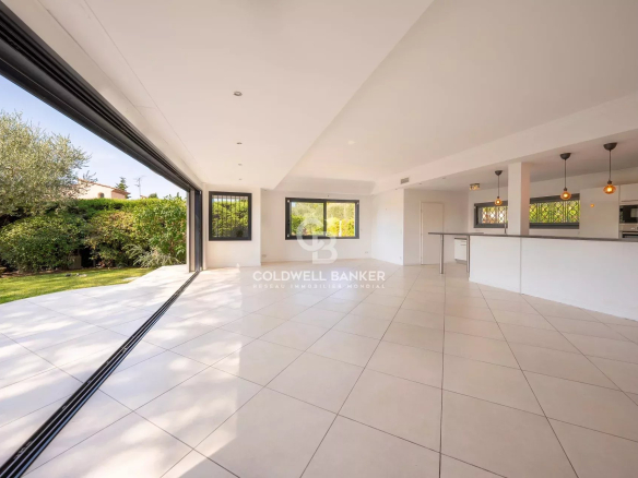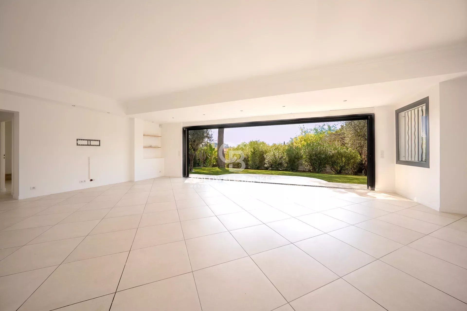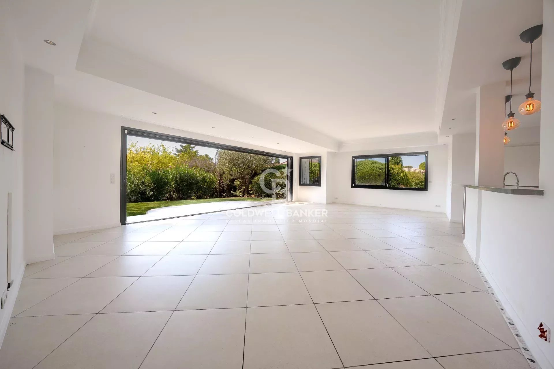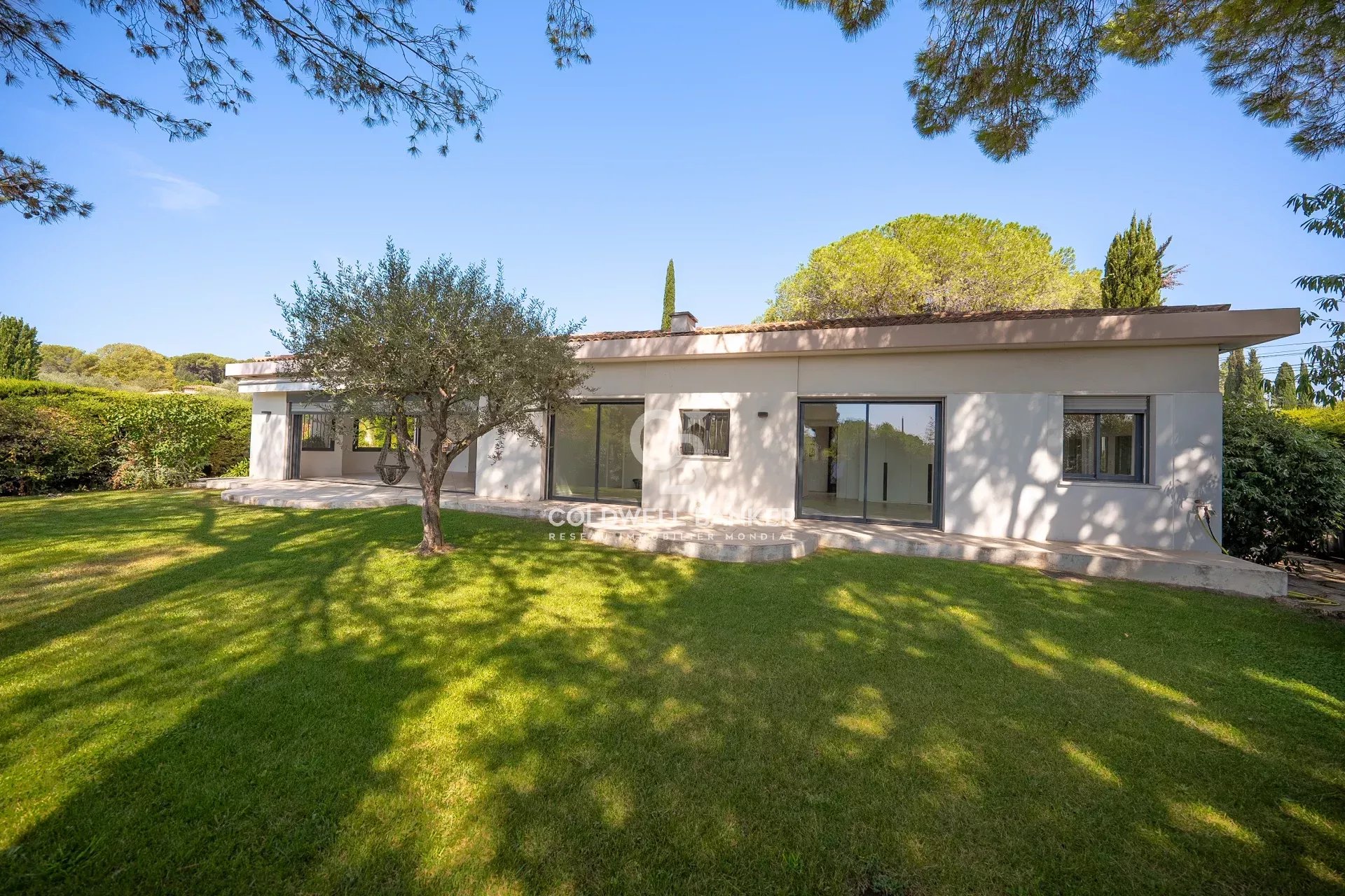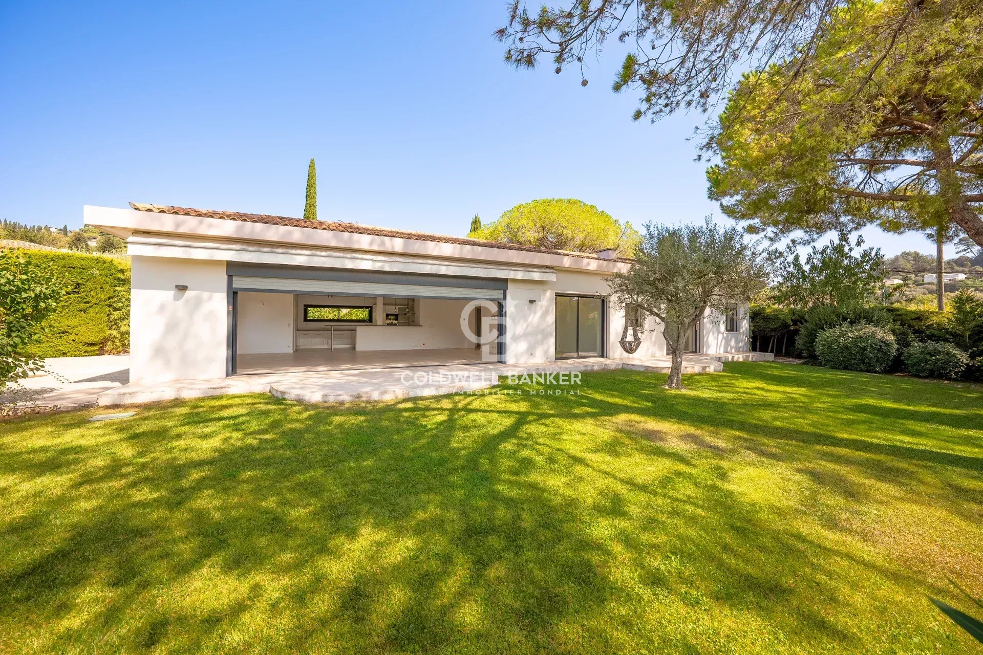 Lumineuse villa de plain pied de 163m2 installée sur 1400m2 de terrain, située dans un quartier résidentiel de Mougins.