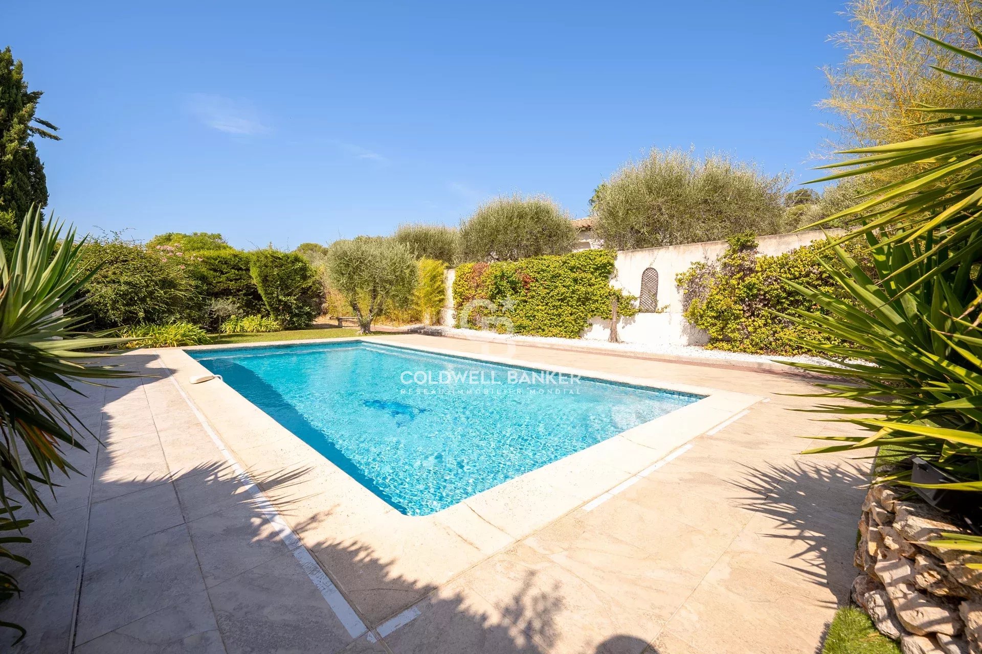 Jardin méditerranéen plat, agréablement ombragé, avec piscine exposée plein sud à l’abri des regards.