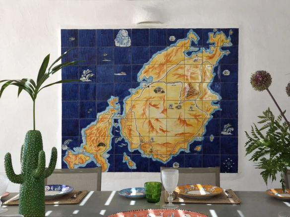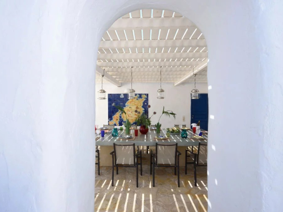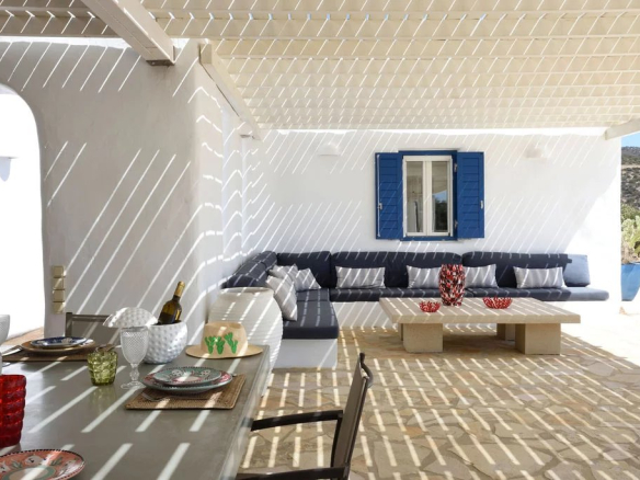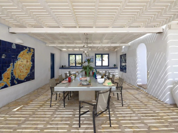 Une majestueuse salle à manger extérieure accueille jusqu’à 16 convives, à quelques pas seulement de la plage de Faraggas.