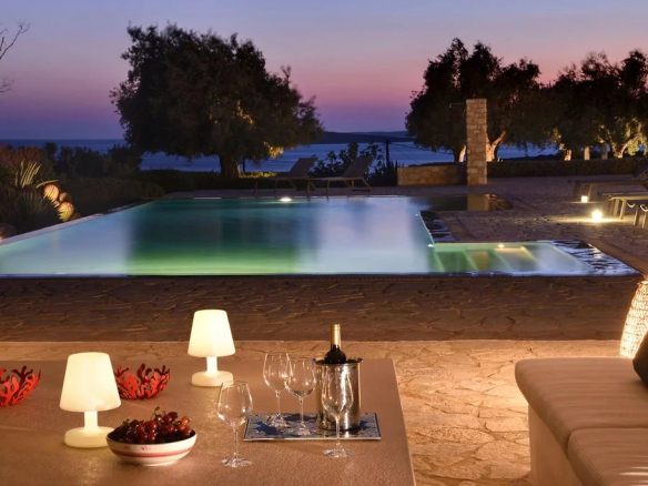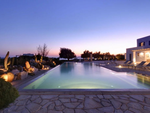 Somptueuse villa à Faraggas, Paros : 550 m², 8 suites, piscine à débordement, vue panoramique sur la mer Égée. Un luxe rare en harmonie avec la nature.
