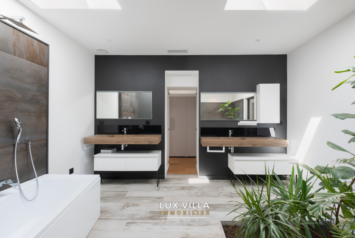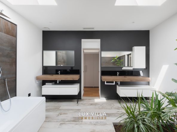 Suite parentale de 70 m2 avec dressing et salle de bains (baignoire, douche à l’italienne, vasques double, jardinière, baie vitrée).