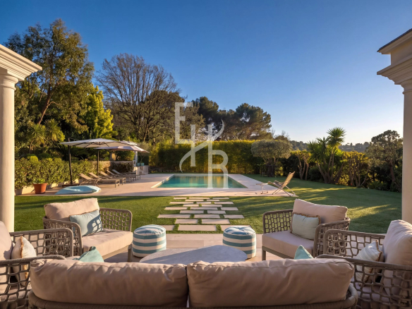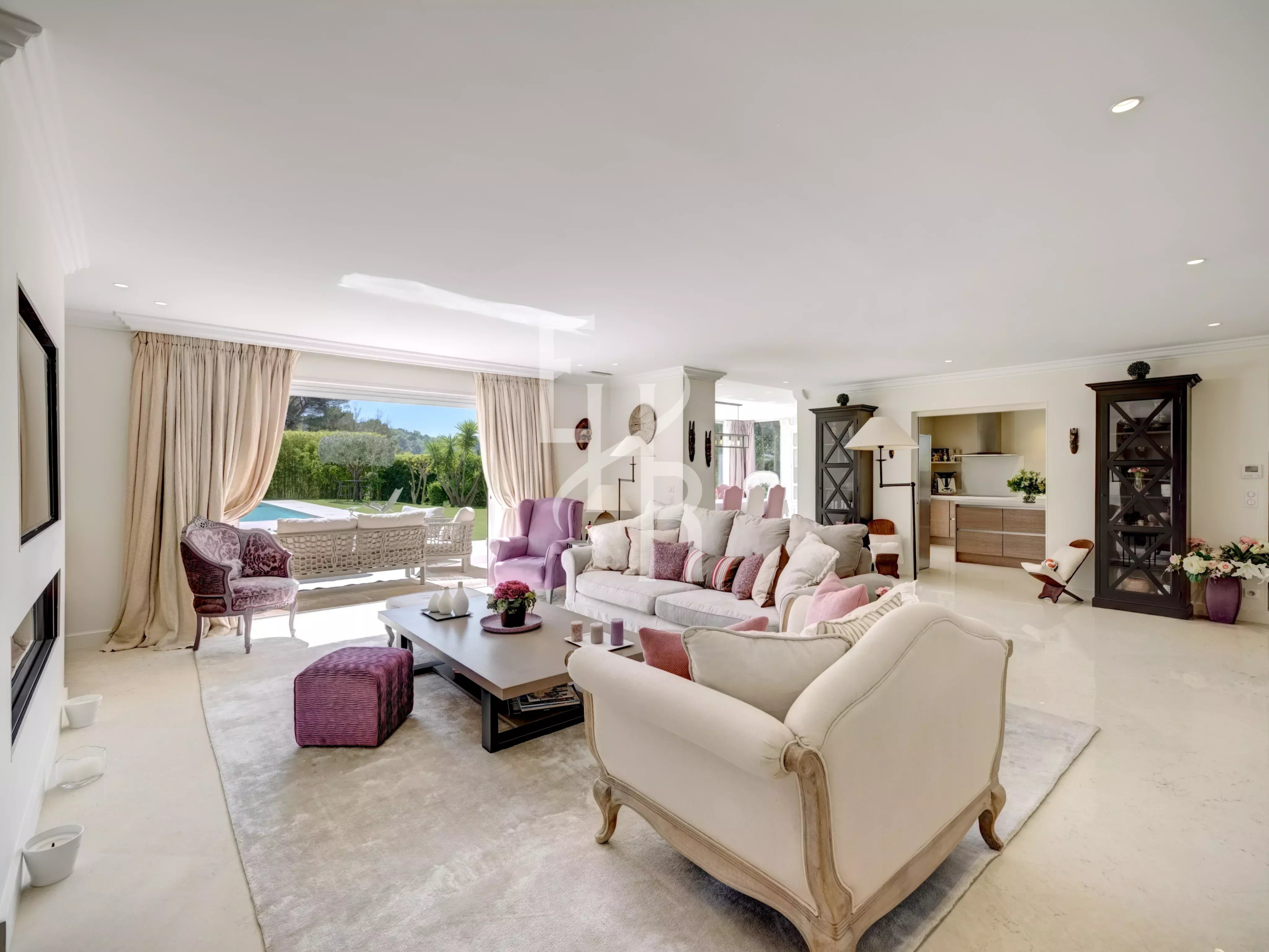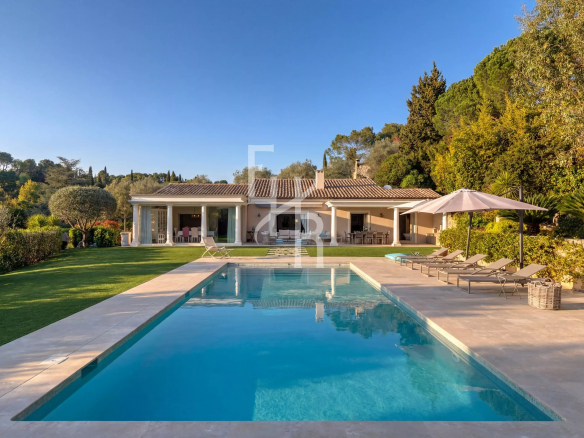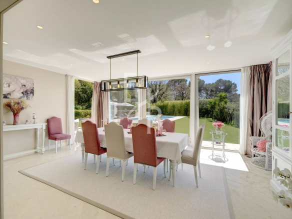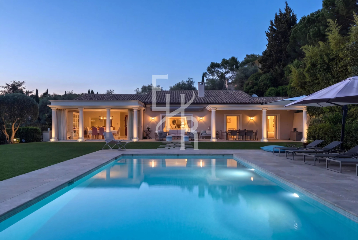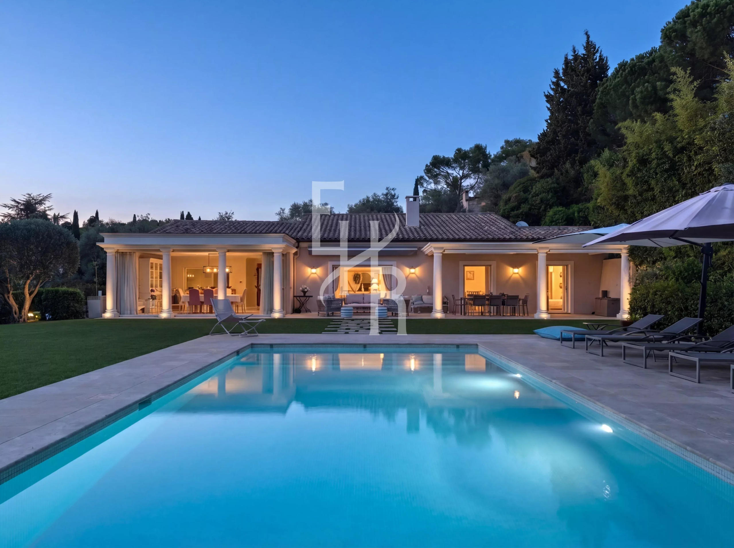 Exceptionnelle villa, nichée au cœur d’un domaine prestigieux et sécurisé, à seulement quelques minutes du charmant vieux village de Mougins et de toutes les commodités.