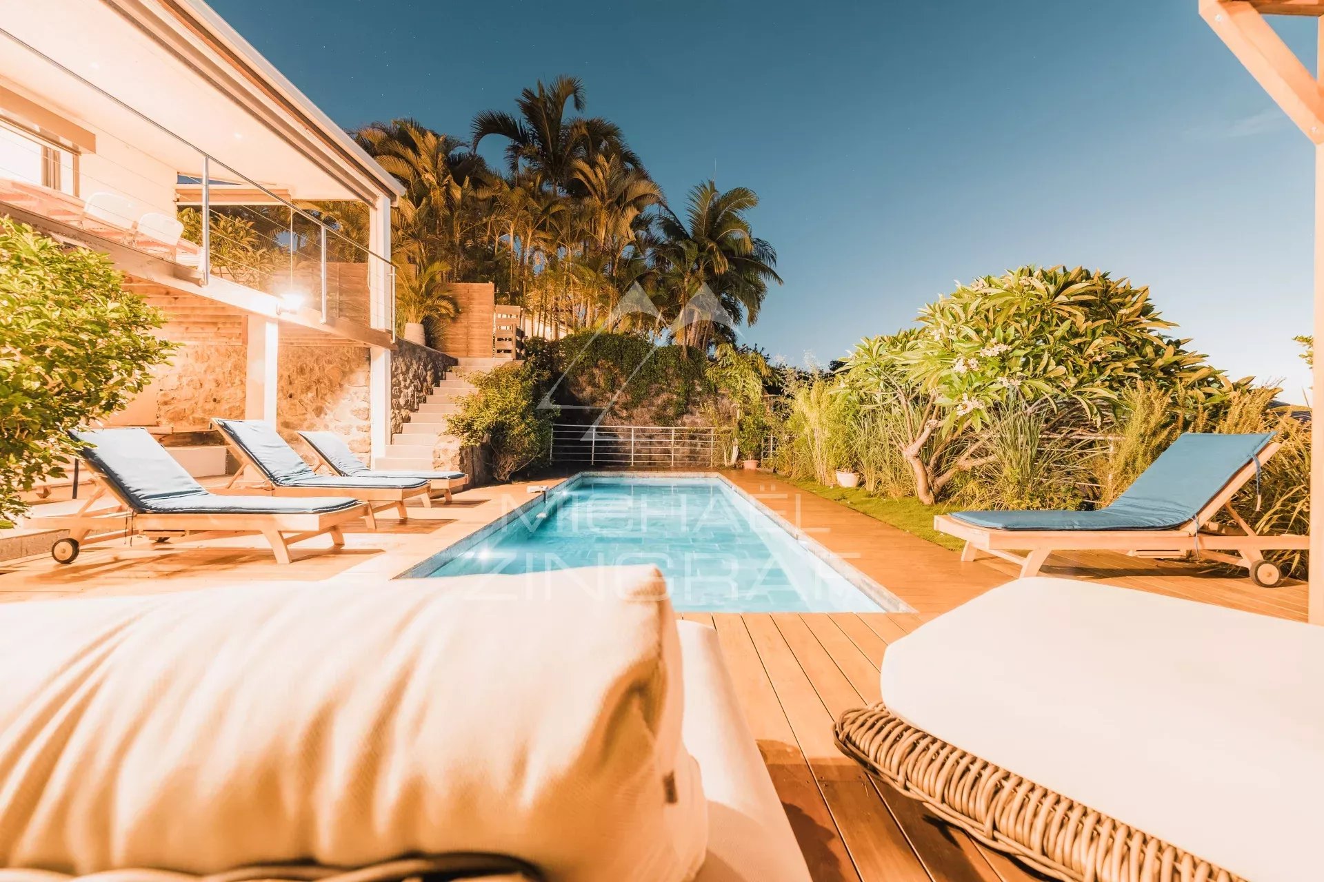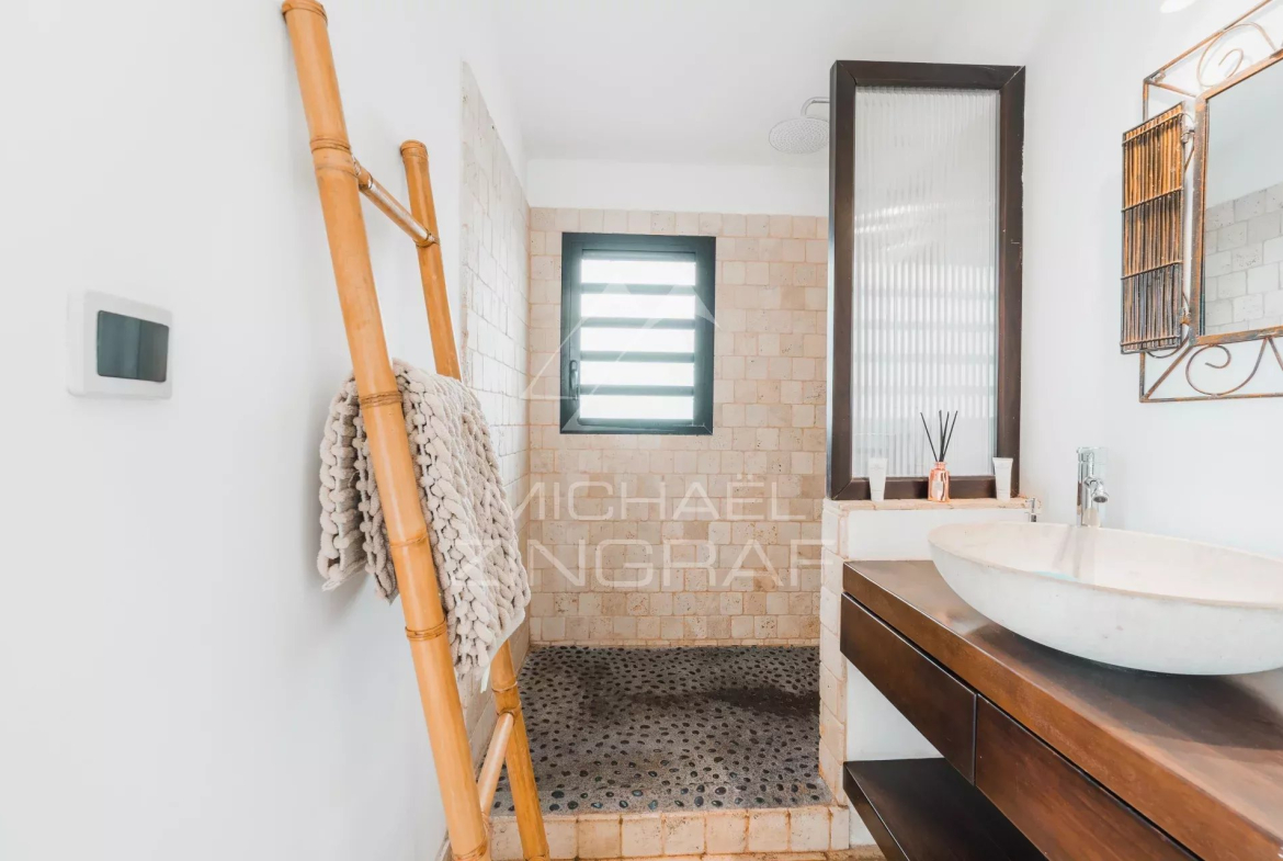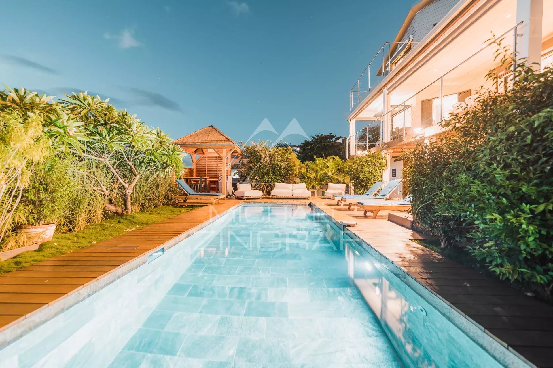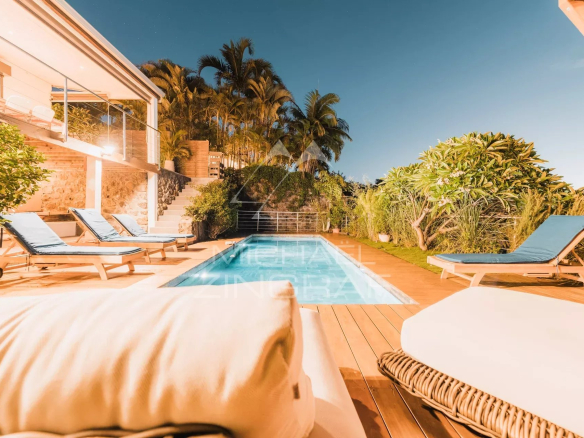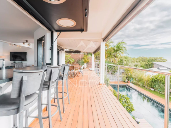 Le rez-de-chaussée profite d’un espace extérieur, conçu pour la détente et le bien-être, qui s’articule autour d’une piscine en pierre naturelle, encore sous garantie décennale. Pour des moments de convivialité en toute élégance, un kiosque en bois de tamarin trône fièrement au cœur d’un somptueux deck en Ipé, où un mobilier extérieur d’exception vient parfaire ce décor idyllique.