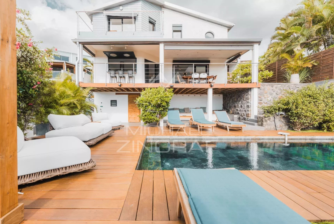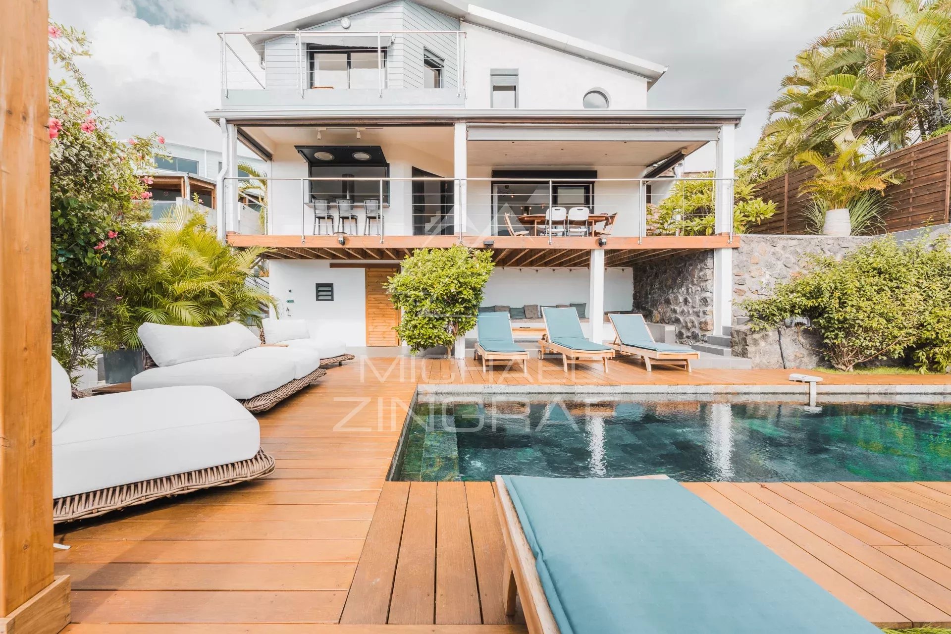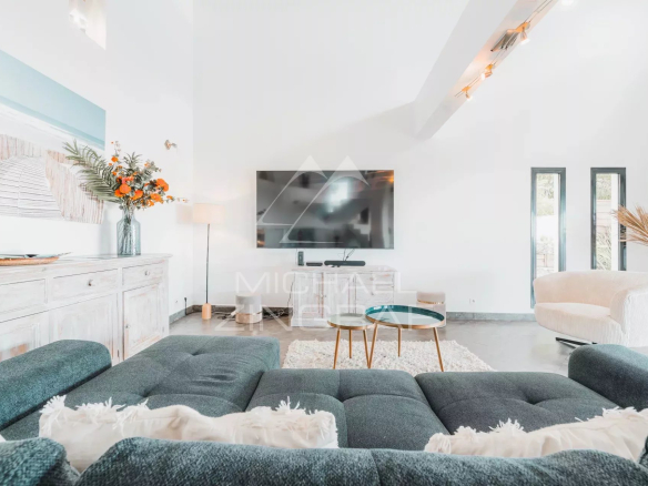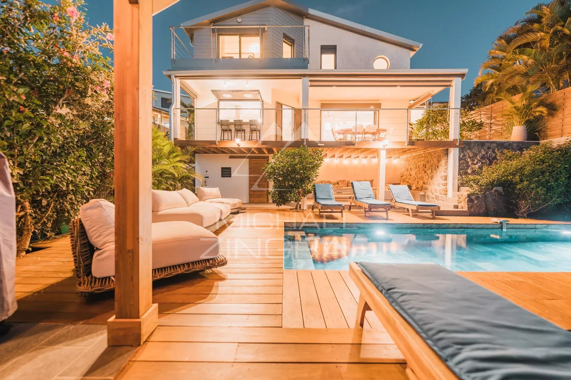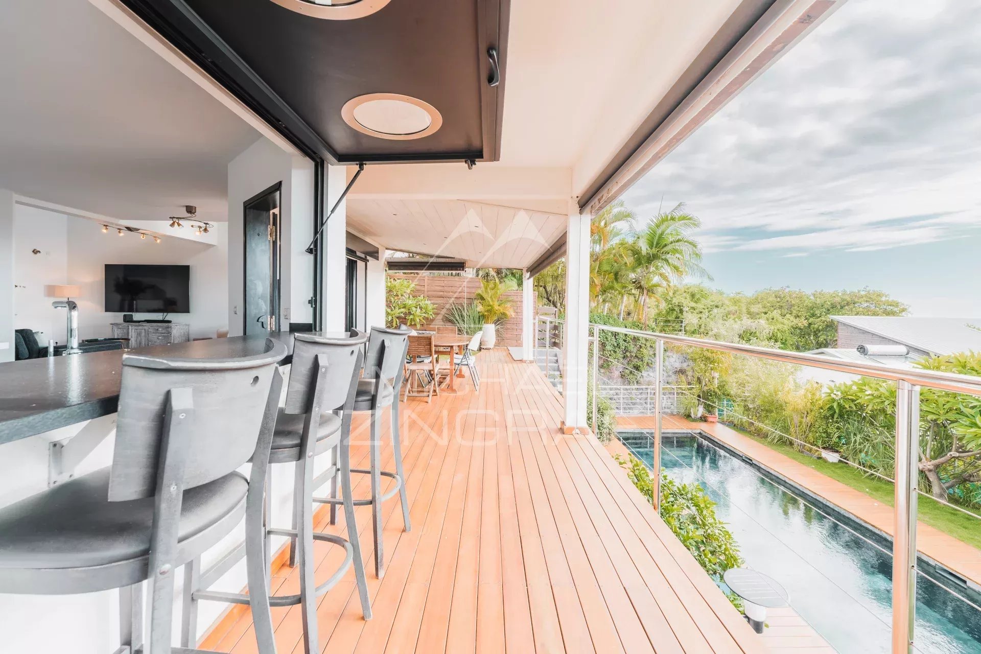 Le rez-de-chaussée profite d’un espace extérieur, conçu pour la détente et le bien-être, qui s’articule autour d’une piscine en pierre naturelle, encore sous garantie décennale. Pour des moments de convivialité en toute élégance, un kiosque en bois de tamarin trône fièrement au cœur d’un somptueux deck en Ipé, où un mobilier extérieur d’exception vient parfaire ce décor idyllique.