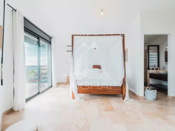 Le troisième niveau accueille la suite parentale climatisée qui bénéficie de sa salle de bain privative avec sa douche à l’italienne et ses aménagements optimisés pour un confort de vie inégalé. Profitez d’une vue extraordinaire sur l’océan, la savane et particulièrement sur la pointe au sel sur son balcon privatisé.