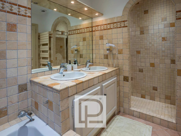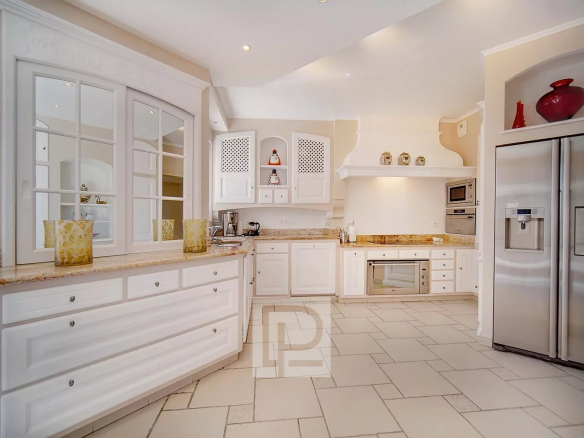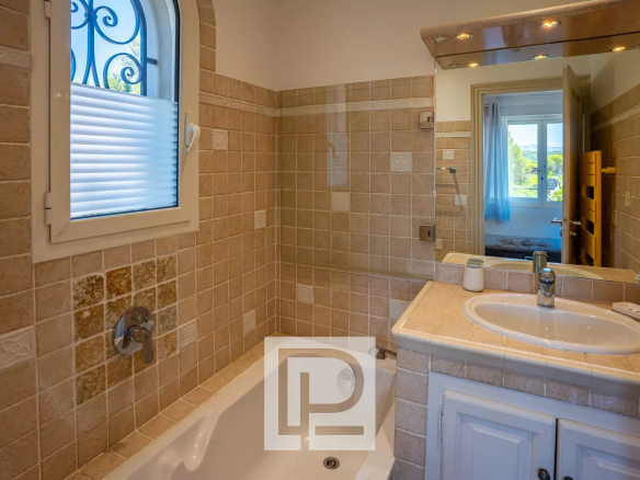 La villa dispose de prestations complètes : chauffage au sol, climatisation, alarme, finitions récentes. Les espaces de vie s’ouvrent largement sur un jardin accueillant une piscine au sel, un terrain de tennis, un terrain de pétanque et une vaste cuisine d’été avec barbecue Weber.