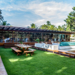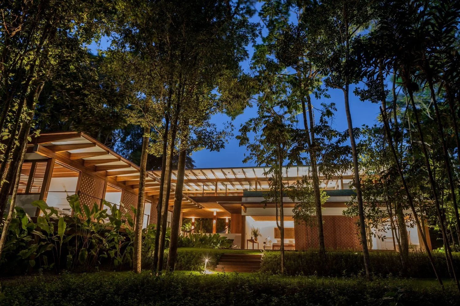 Les chambres à coucher, nichées dans le deuxième pavillon, offrent des vues splendides sur le jardin et la forêt pour toutes les suites sauf une, stratégiquement situées à côté d’un havre de paix tranquille avec hamac.
