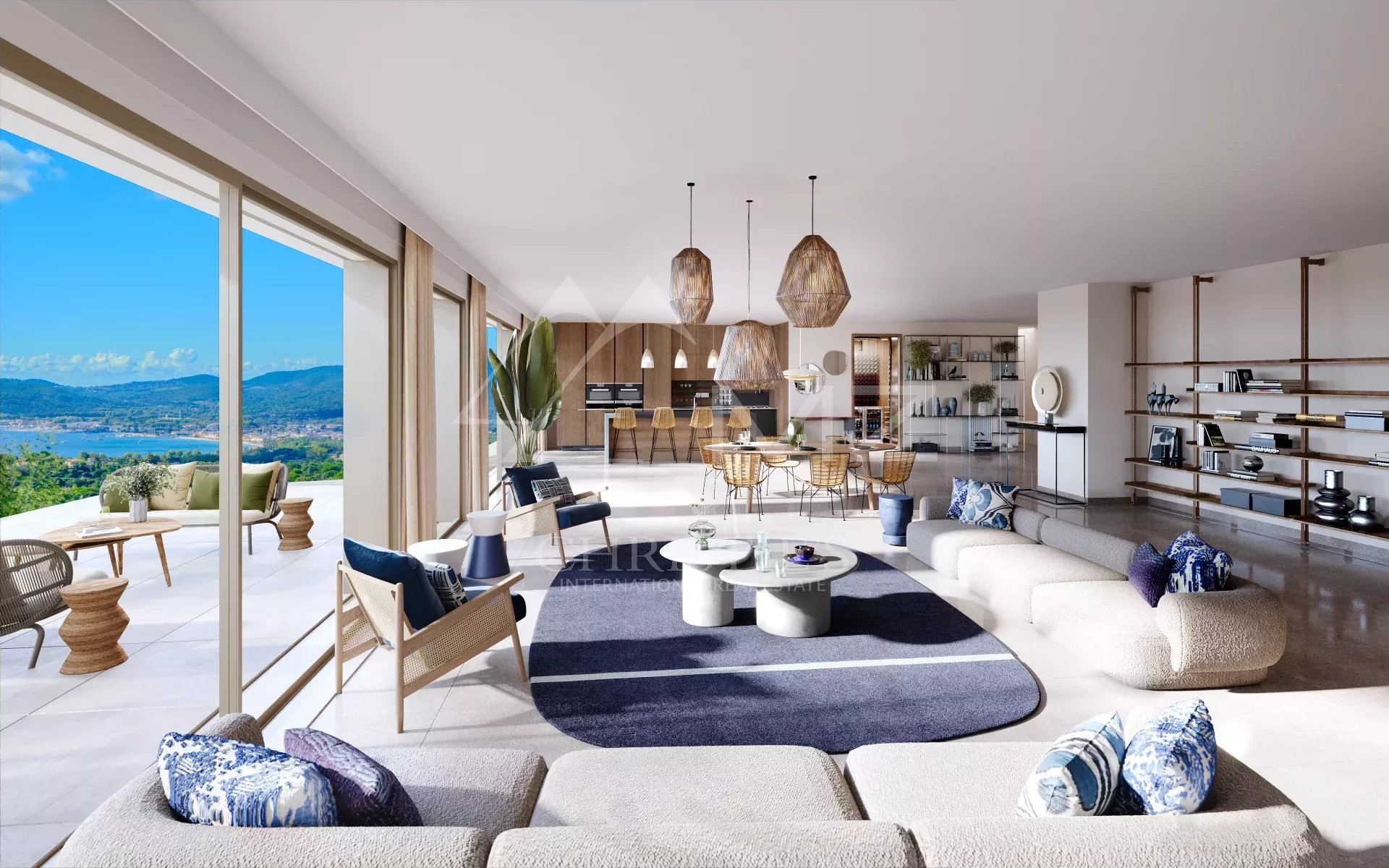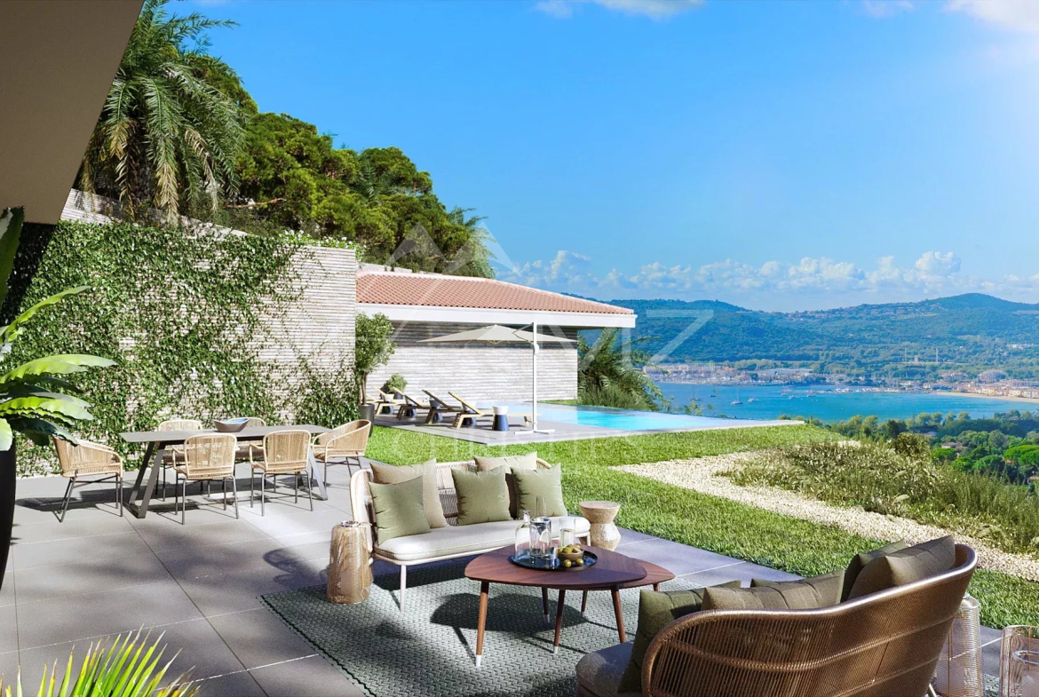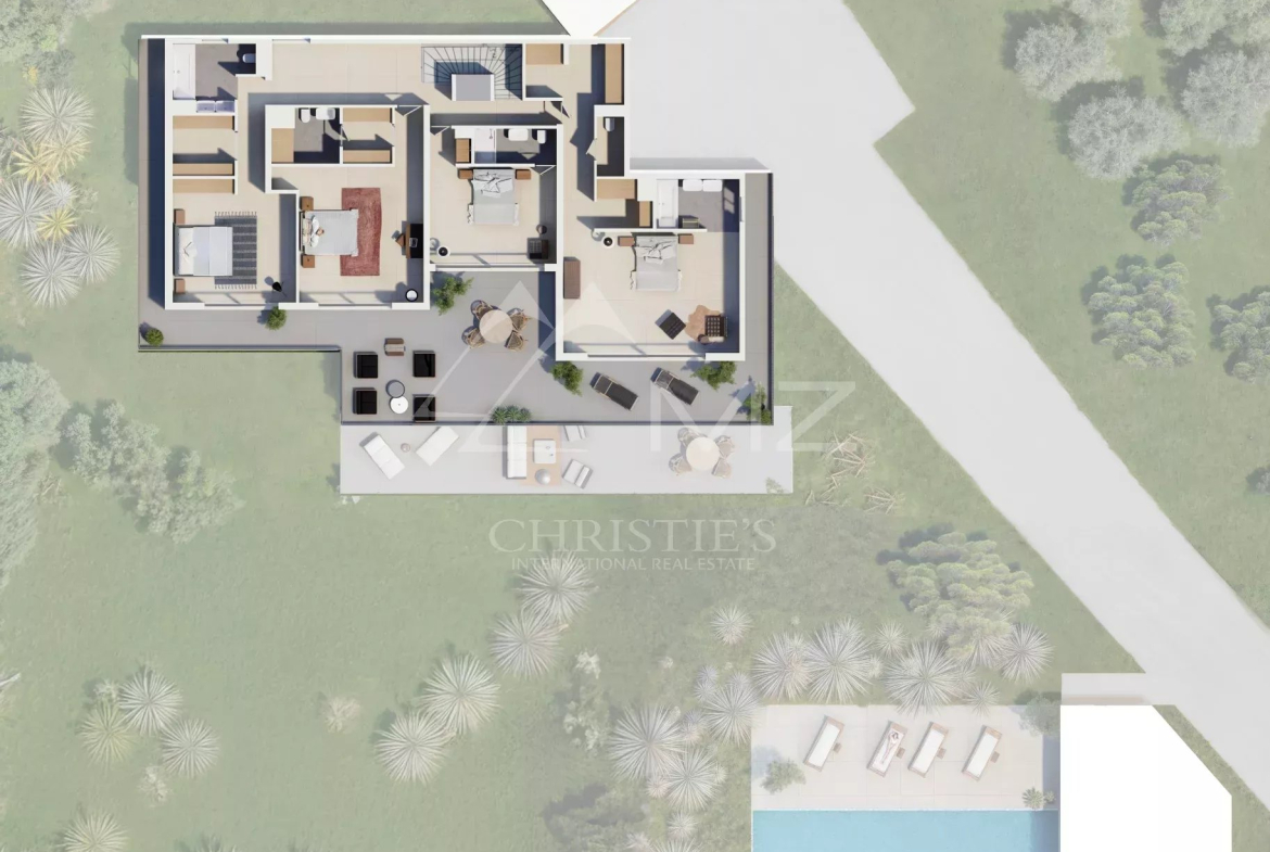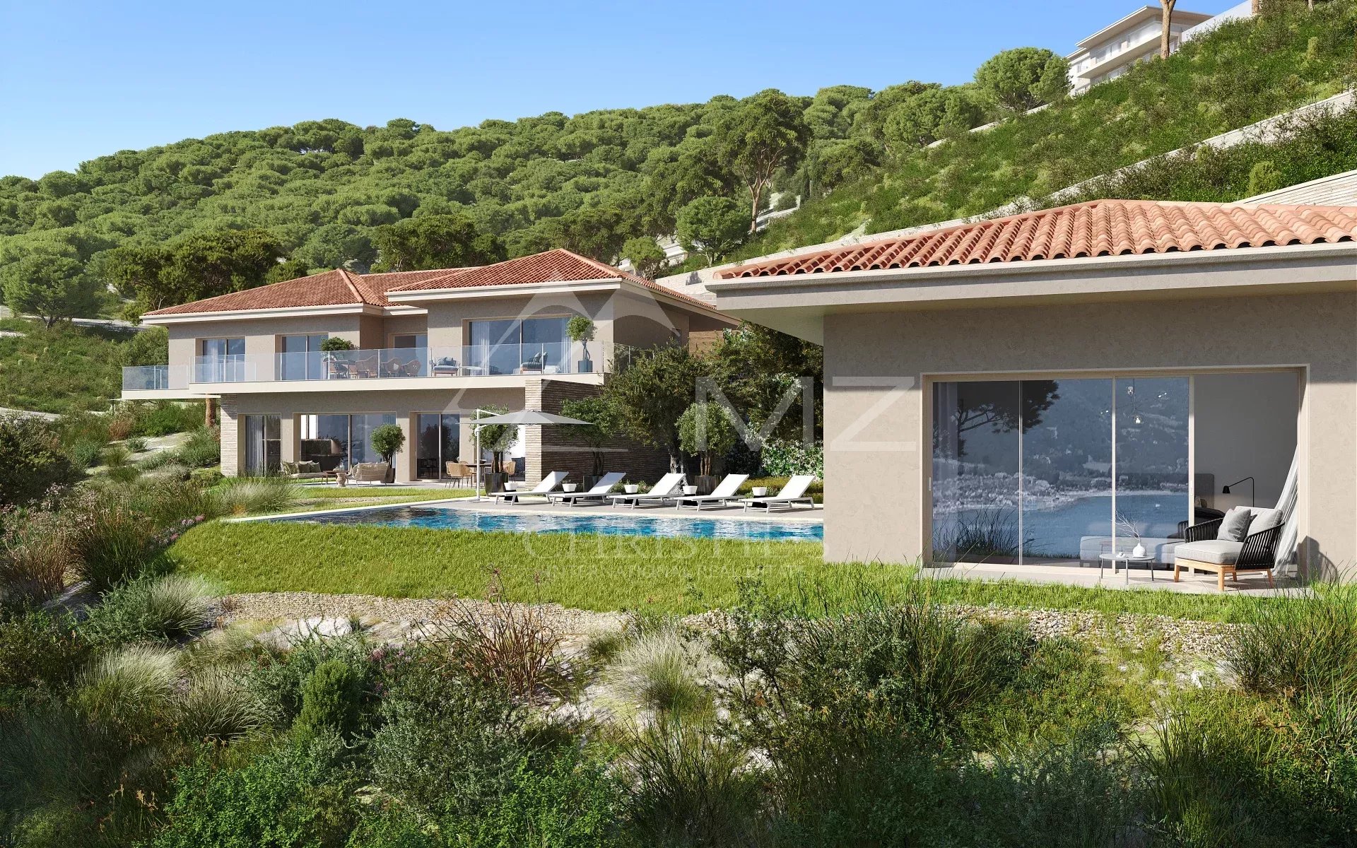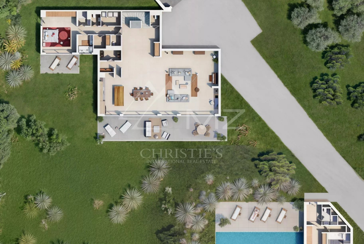 À l’extérieur, le pool house et le jardin paysager invitent à la détente, tandis qu’une magnifique plage piscine promet des moments de relaxation inoubliables, le tout offrant une vue imprenable sur la mer et les collines environnantes.
