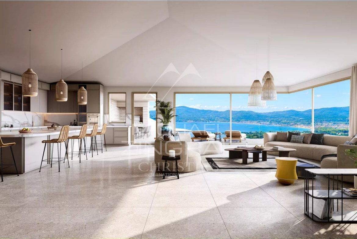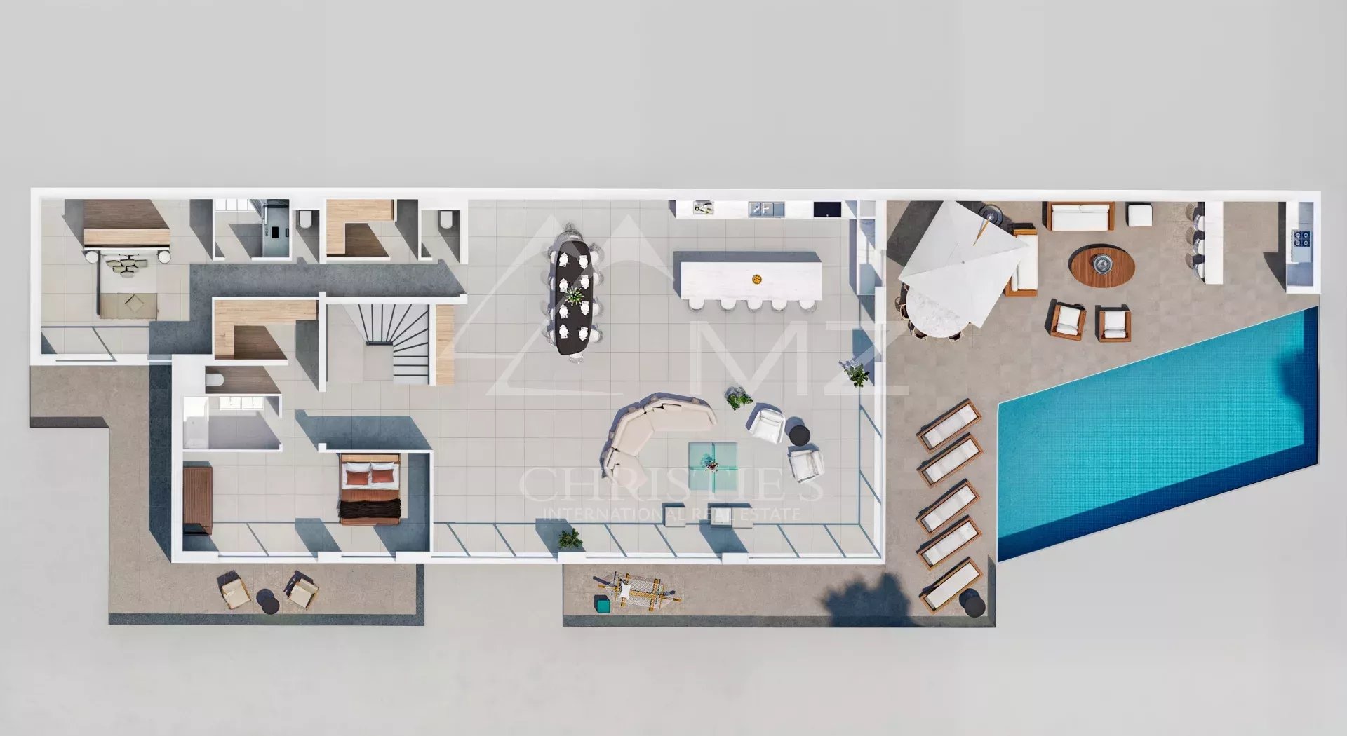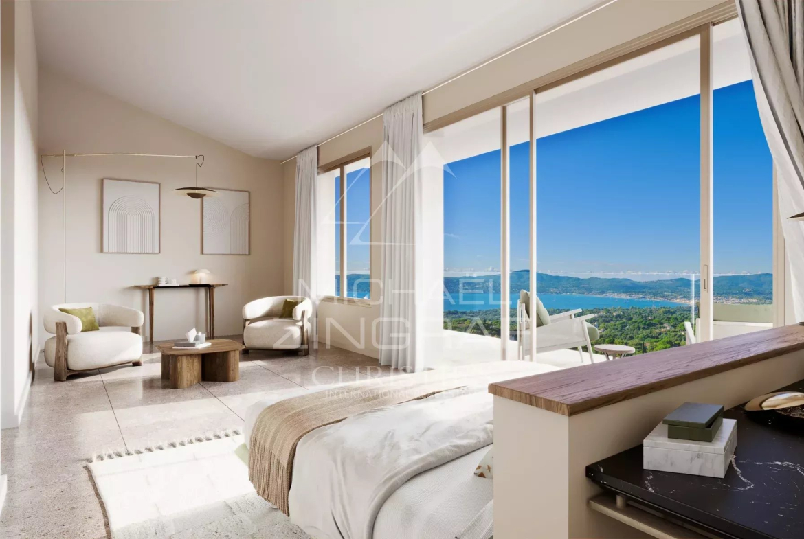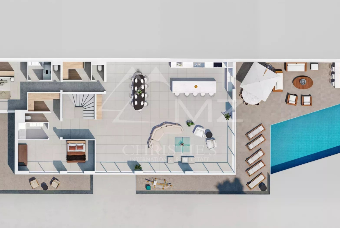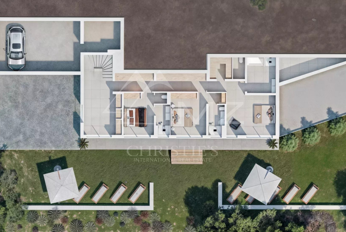 Elle se distingue par un vaste espace de vie lumineux de plus de 160 m² avec cuisine ouverte, conçu pour maximiser la vue dégagée. Cinq suites, chacune avec salle de bains privative, complètent les espaces nuit, dont une somptueuse chambre de maître avec dressing et terrasse privée offrant une vue mer.