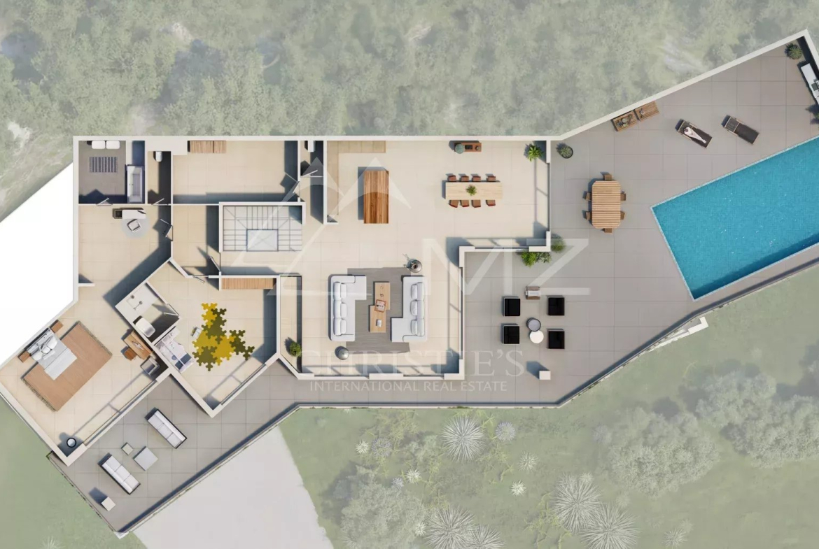 À l’extérieur sur un panorama mêlant mer et collines, vous trouverez un jardin paysager et une superbe piscine.