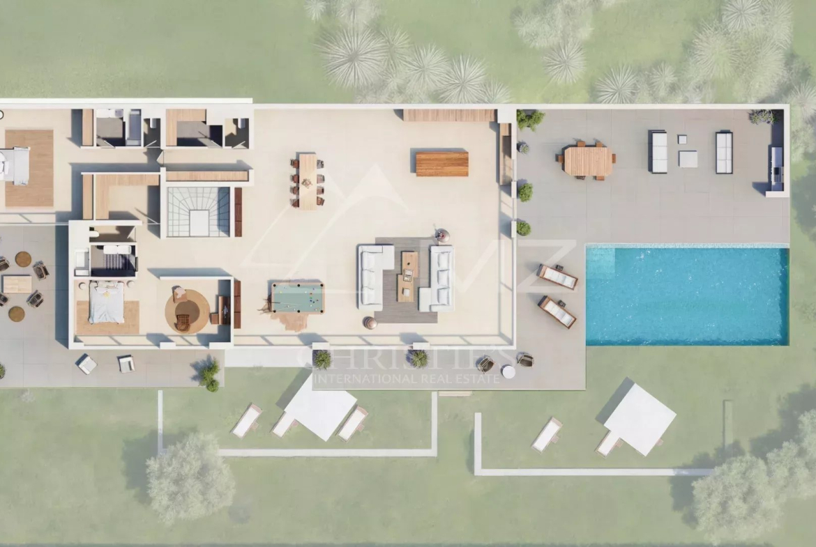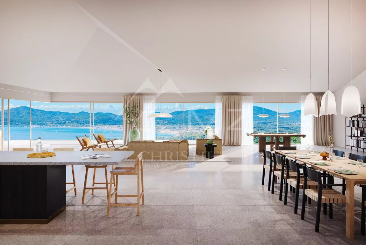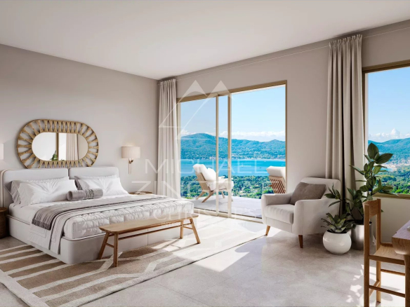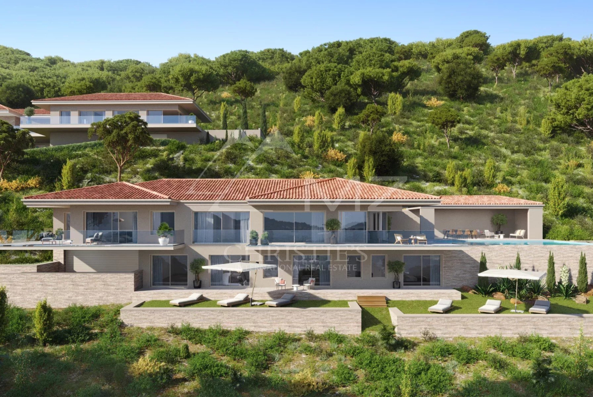À l’extérieur, un jardin paysager soigneusement conçu entoure une superbe piscine, offrant un cadre idyllique pour se détendre. Le tout s’ouvre sur un panorama à couper le souffle, alliant mer et collines, pour des moments de sérénité inégalés.
