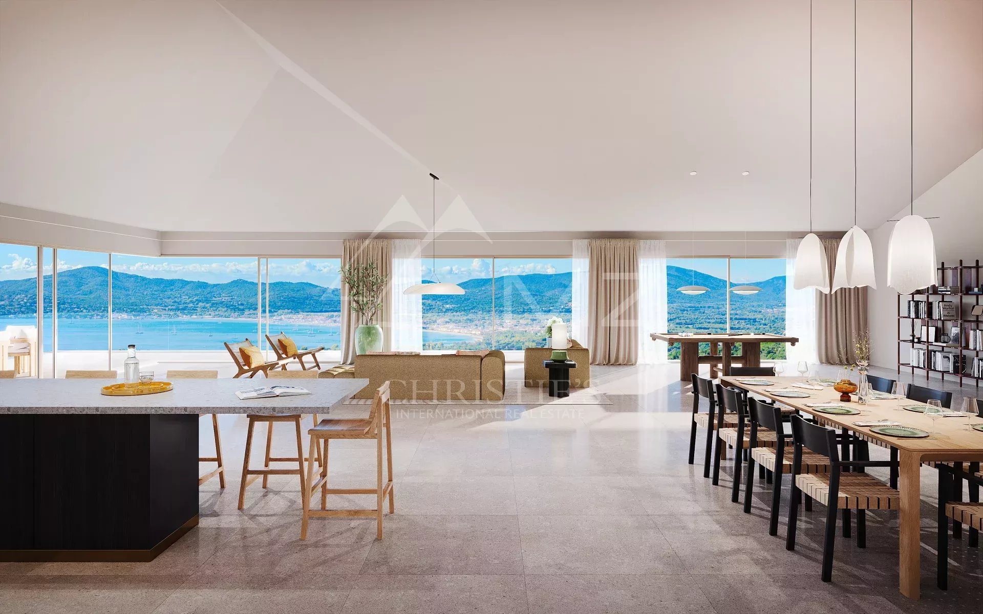 L’intérieur de la villa se compose d’un vaste séjour lumineux, idéal pour accueillir famille et amis, et d’une cuisine ouverte parfaitement intégrée.