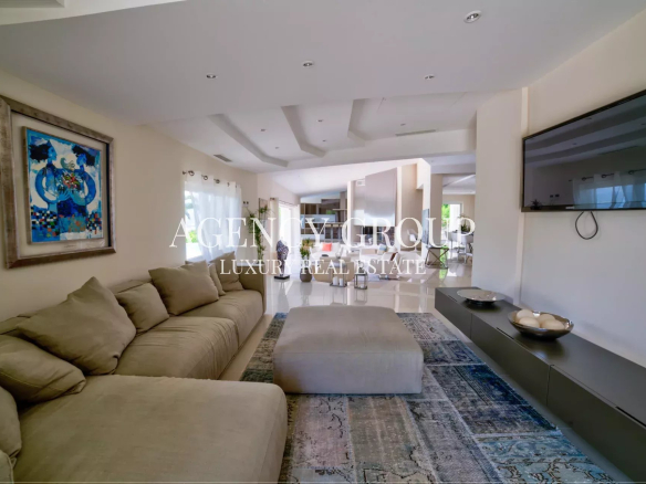 Un double séjour donnant sur un agréable salon avec cheminée, une cuisine américaine équipée, salle à manger, coin bibliothèque le tout donnant sur une terrasse et la piscine à débordement.