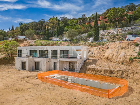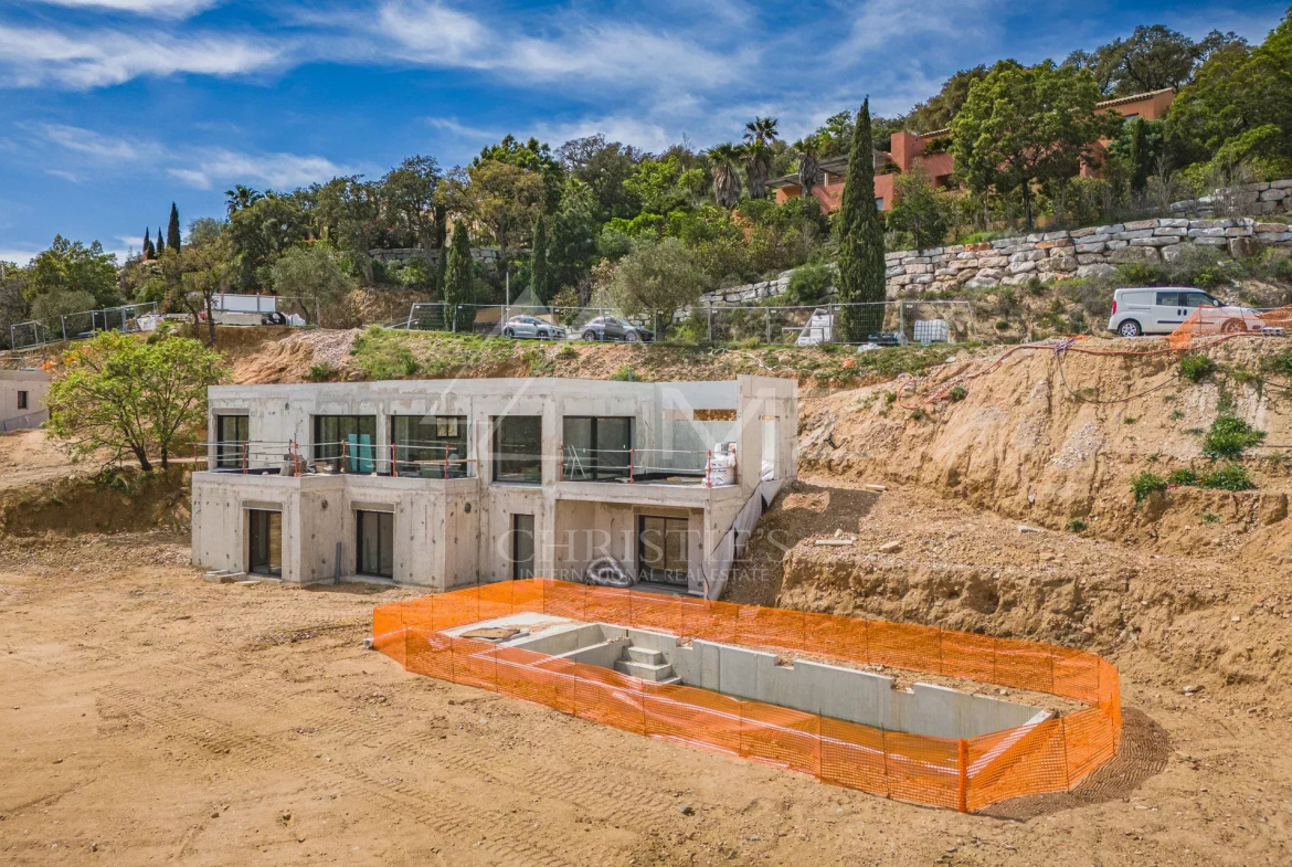 Luxueuse villa neuve dans les hauteurs de Grimaud, proche du village, située dans un domaine privé offrant une vue dégagée sur les collines tout en bénéficiant d’une vue mer.