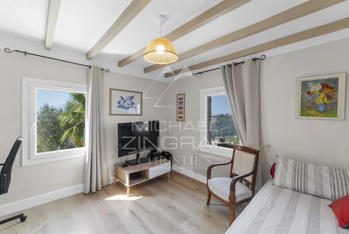 À l’étage, deux belles chambres avec rangements bénéficient d’une vue imprenable sur la mer et les collines, complétées par une spacieuse salle de bains raffinée.